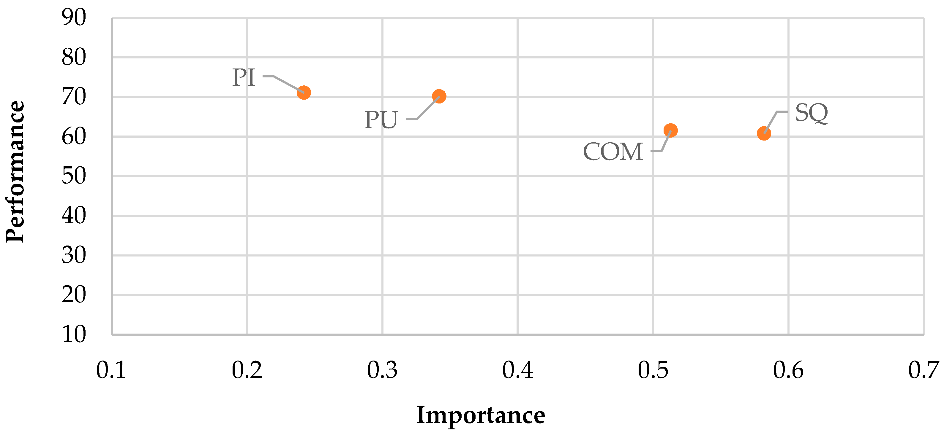 | Latent Constructs | Performance Impact Total Effect (Importance) | Index Values (Performance) |