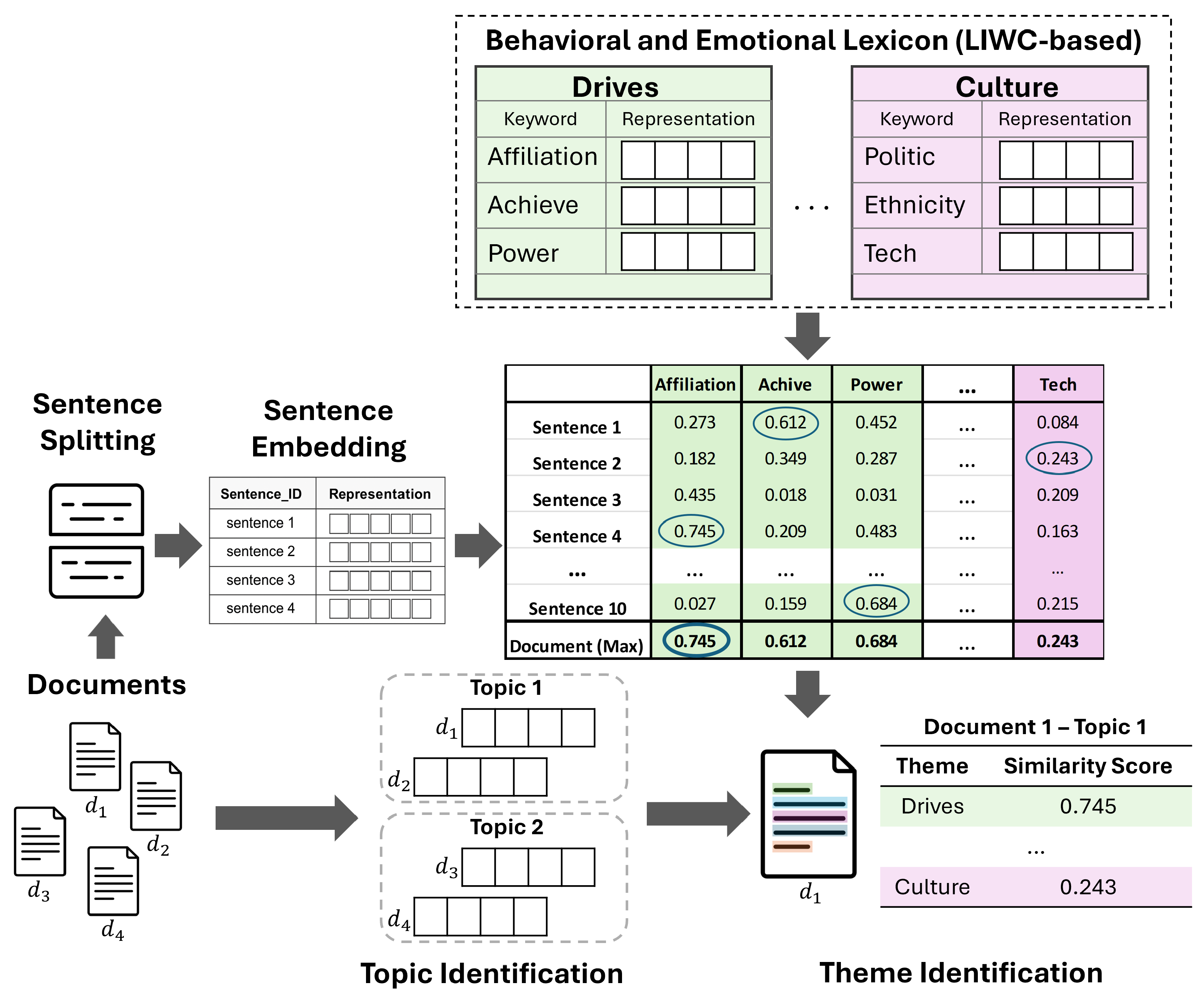 Our method comprises four primary steps. First, we transform documents into dense embeddings that capture their latent semantic structures, providing continuous vector representations of narrative content. Second, these embeddings serve as input to unsupervised topic identification through clustering techniques, grouping narratives by thematic similarity. Third, we detect explicit emotional and sociocultural dimensions by computing semantic similarity between sentence embeddings and predefined categories from an established psychological and sociological lexicon. Finally, we integrate the detected emotional patterns with document-level topic assignments to generate a distribution of behavioral and emotional themes that characterizes each narrative.