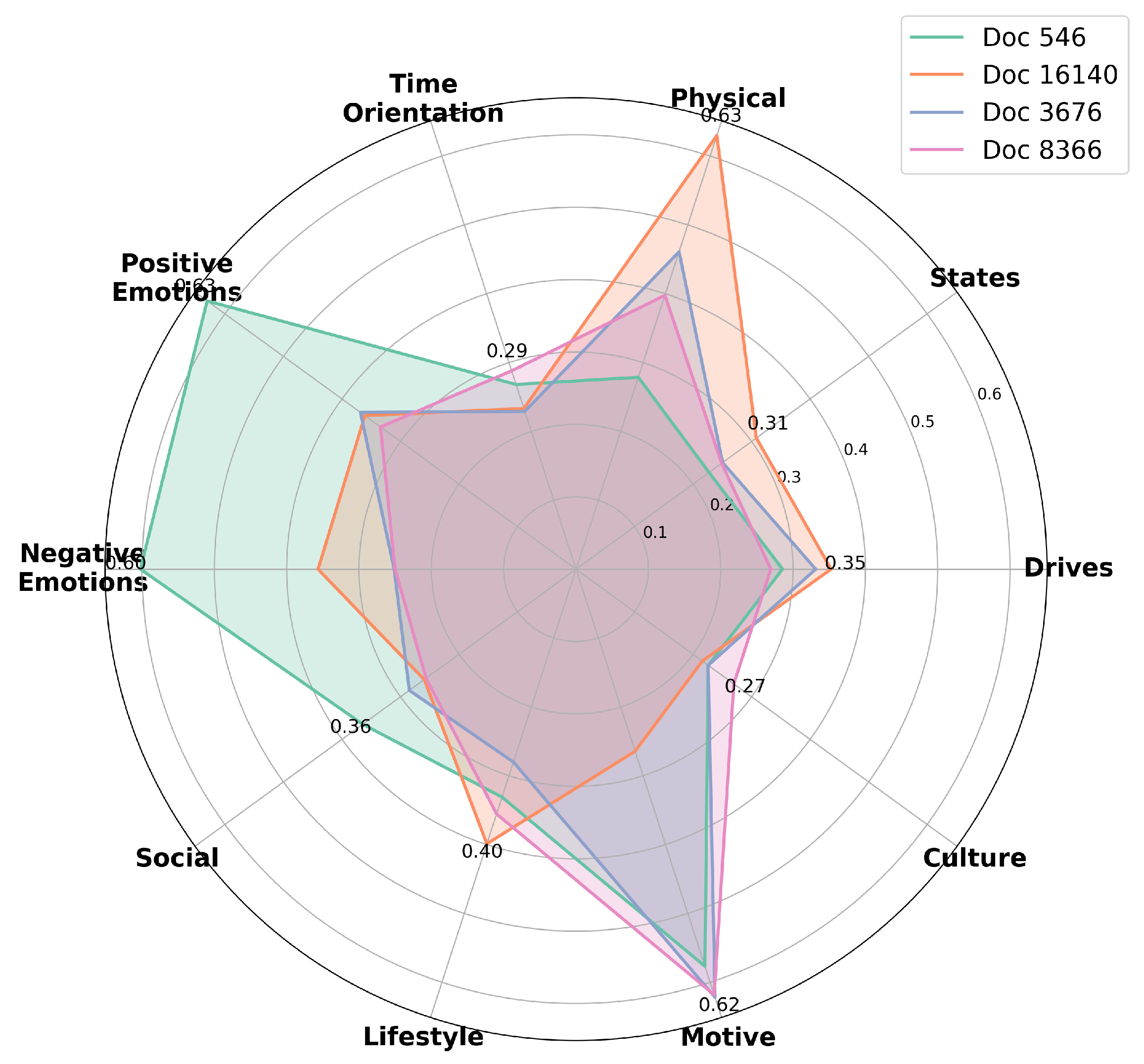 The analysis of this document with BET allows us to demonstrate how emotional and motivational themes relate to the topic of Photography & Film. Similarly, document #16140 (Nutrition & Wellness) exhibits a strong association with the Physical theme, as reflected in its high similarity score (0.63). This correlation is likely influenced by text such as “Allison was a health and wellness advocate, always promoting a balanced and mindful lifestyle.” and “She believed that taking care of one’s physical and mental well-being was crucial for success and happiness.”