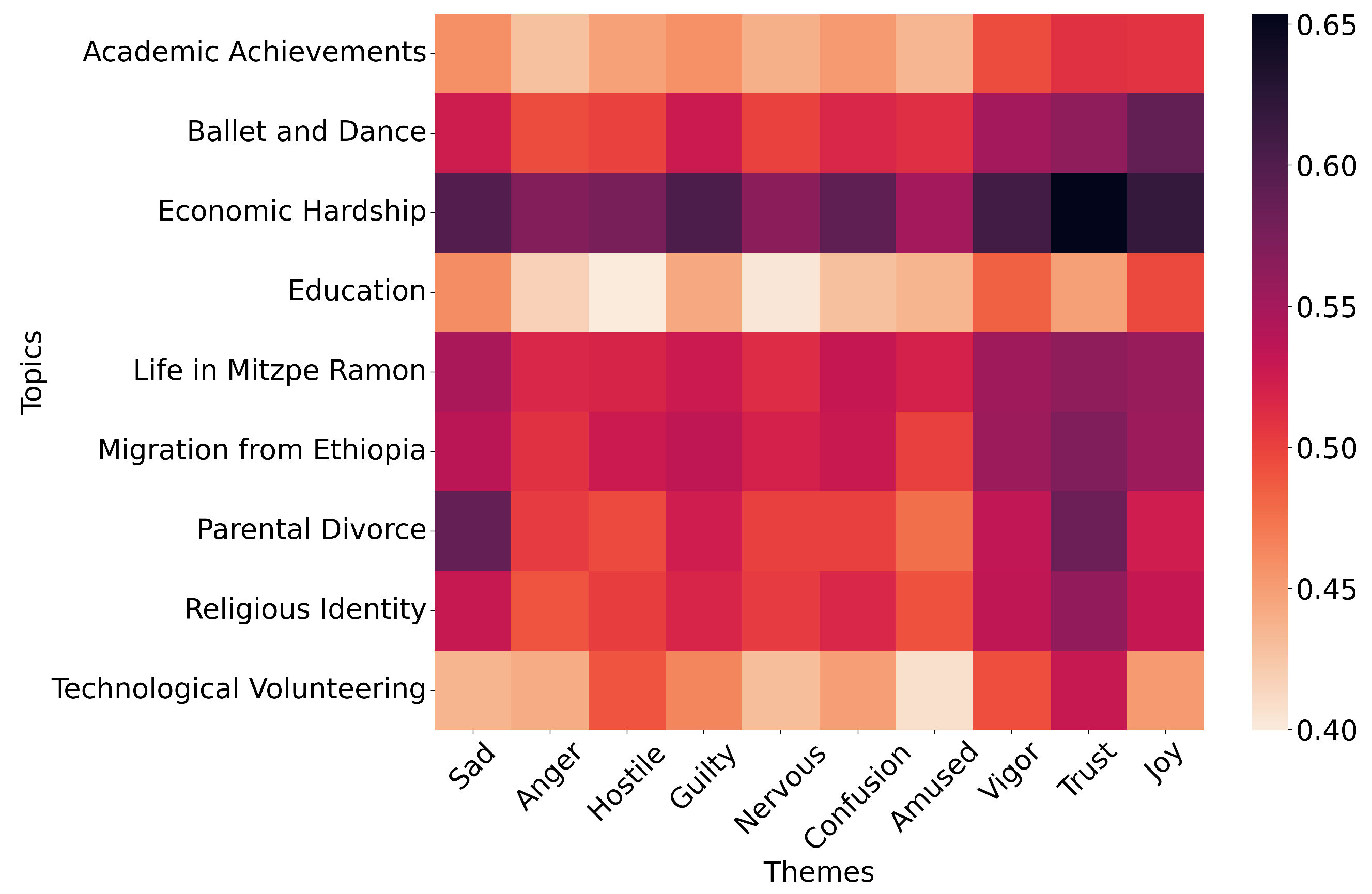 Figure 3 visualizes the similarity scores of a subset of 10 topics and 10 emotional valences, from which we analyze two topics in-depth: Ballet and Dance and Economic Hardship.