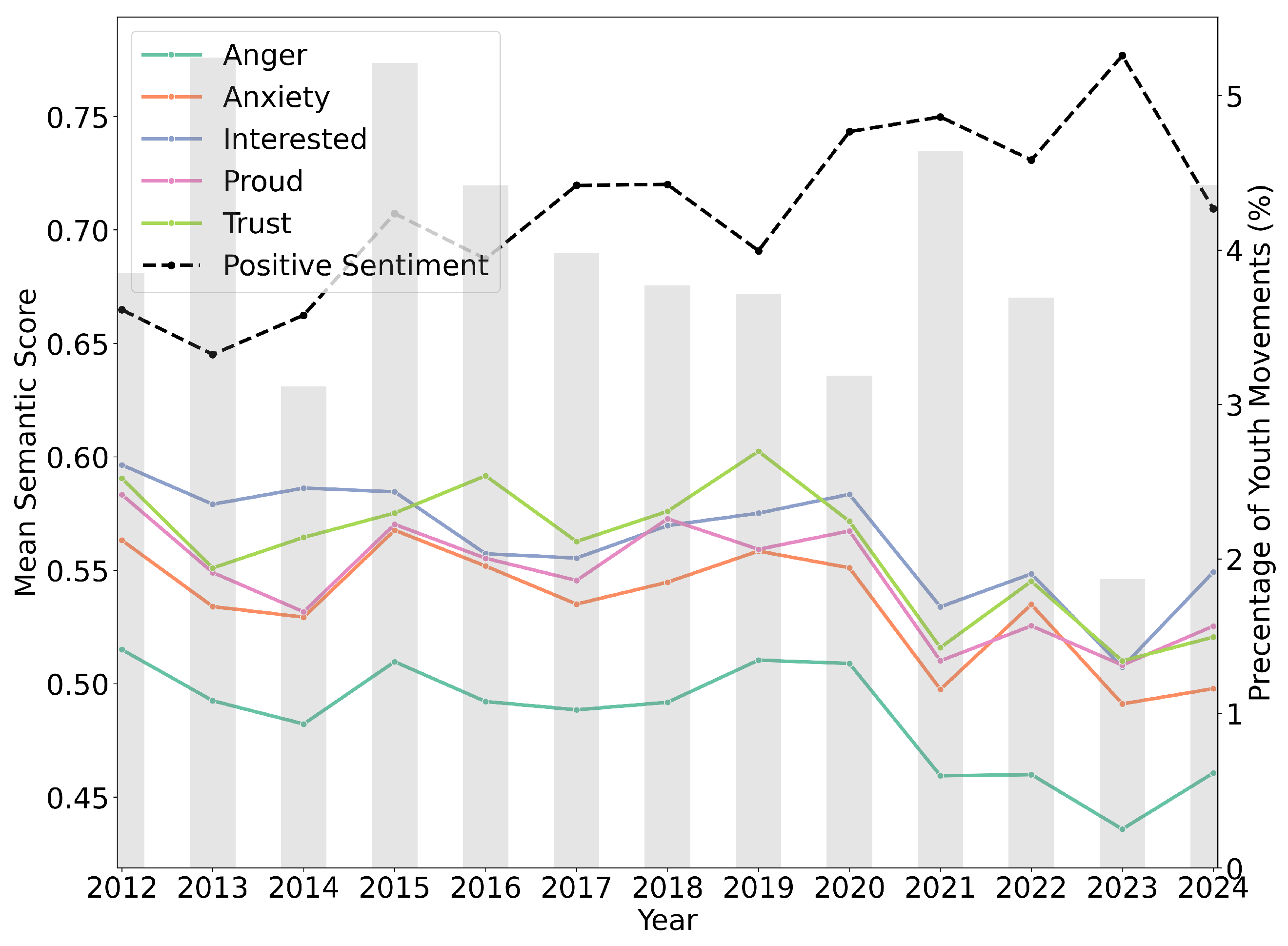 Figure 4 illustrates the average similarity score for each emotional theme per year and the distribution of documents related to youth movements over the years using bar charts.