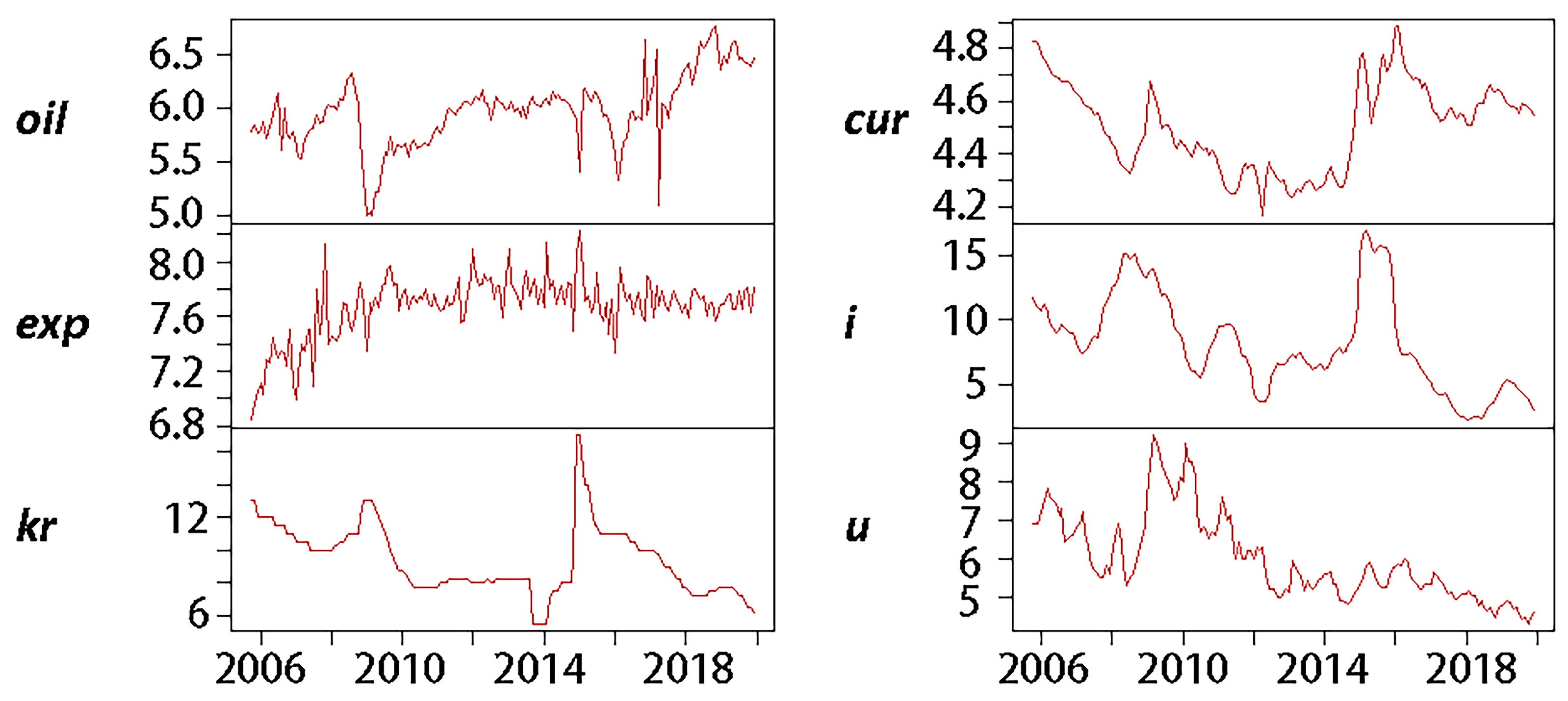 - Nyangarika, A.M.; Tang, B. Influence oil price towards economic indicators in Russia. In Proceedings of the IOP Conference Series: Earth and Environmental Science, Xiamen, China, 3–5 September 2018; Volume 192, p. 012066. [Google Scholar] [CrossRef]
