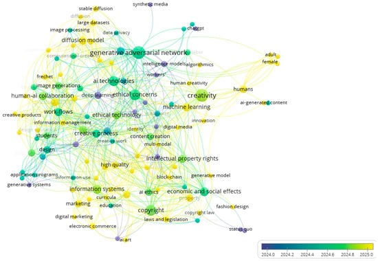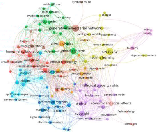 As a further refinement step, generic umbrella terms with limited discriminative value (e.g., artificial intelligence, GenAI, creative industry, creative professionals, article) were excluded, as their high frequency and centrality tend to obscure finer-grained thematic structures. In addition, a thesaurus file was applied to consolidate synonymous and overlapping expressions. For example, highly generic terms such as “technology” or “algorithm” were removed, while more specific expressions like “text generation” or “image generation” were retained. Similarly, closely related variants (e.g., “AI-generated art” and “generative art”) were merged under a unified label to reduce redundancy. These preprocessing decisions enhance interpretive validity by improving thematic resolution and ensuring that detected clusters reflect substantively distinct research directions rather than frequency-driven noise. After these filtering and normalization procedures, the final set was curated to 115 keywords, which served as the basis for keyword co-occurrence analysis and cluster detection.