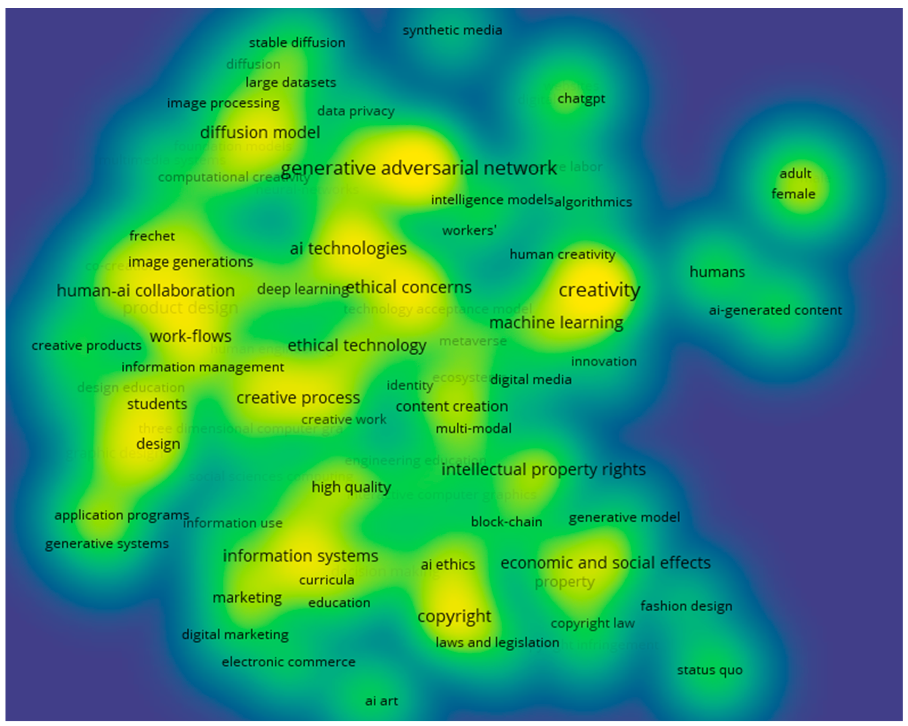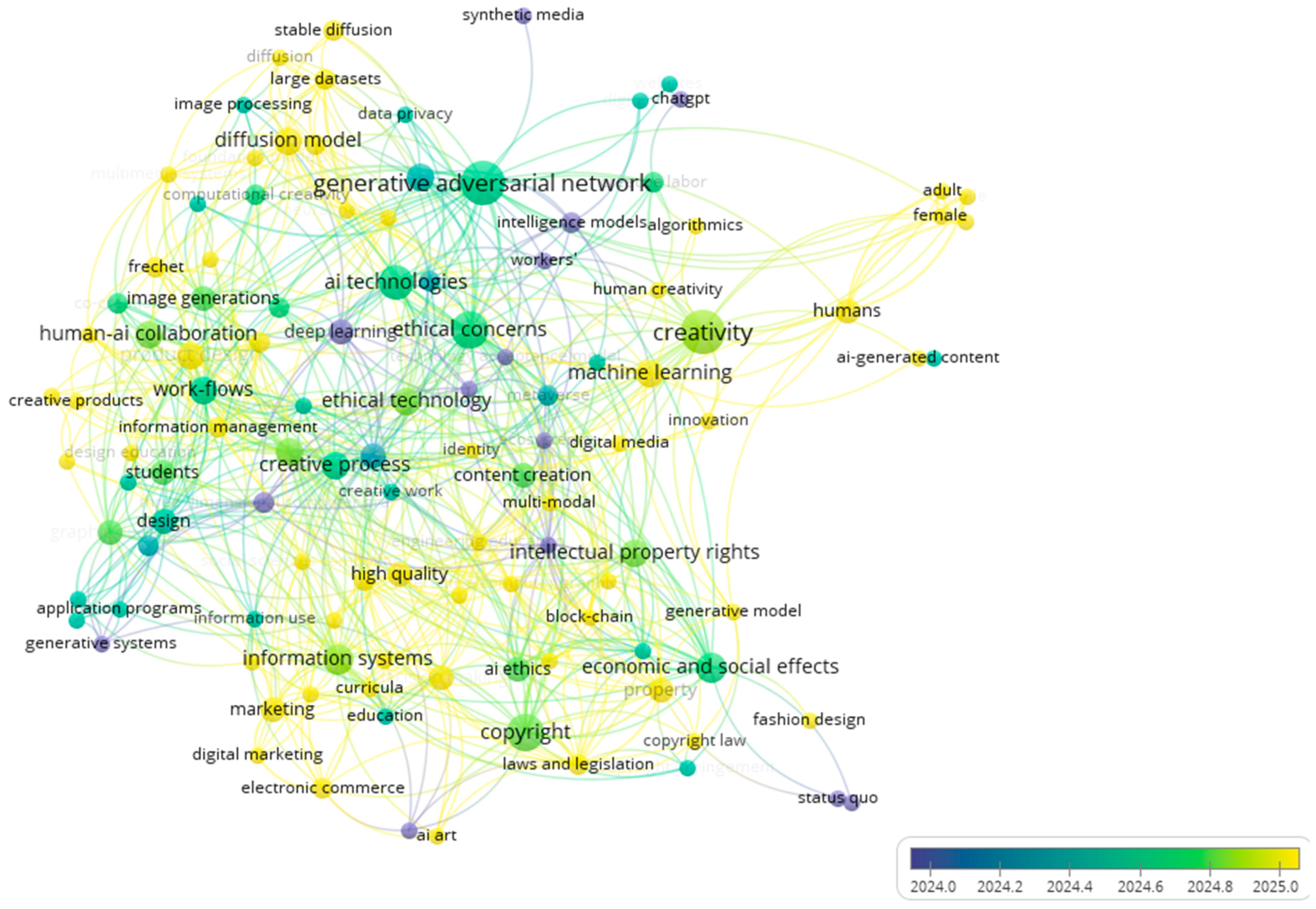 This review contributes to a more integrated understanding of how GenAI is reshaping the creative industries, not only by enhancing individual creativity or technical performance but by transforming the institutional, organizational, and economic contexts in which creative production occurs. Through the combination of bibliometric mapping and thematic co-occurrence analysis, it identifies emerging intellectual directions and clusters that signal a broader paradigm shift—from tool-centred inquiry to system-level theorizing.