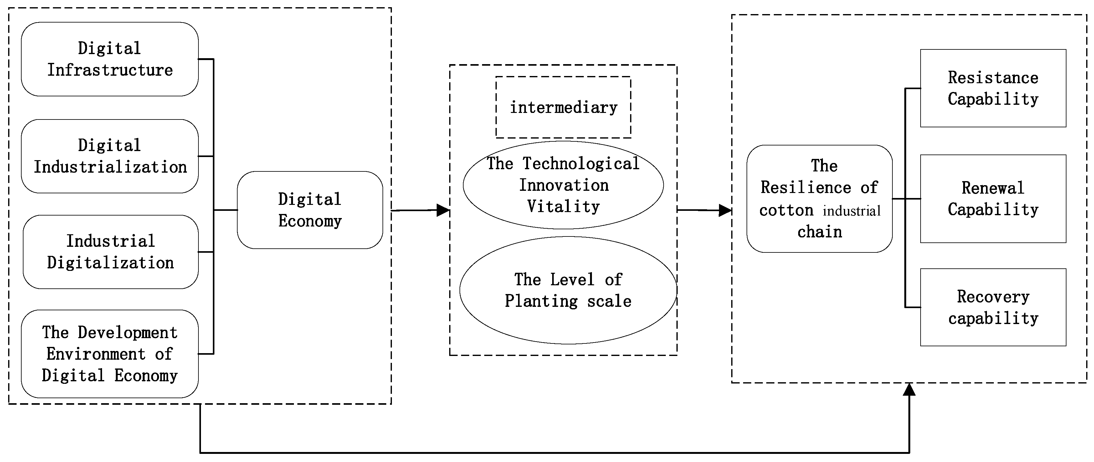 - The mediating effects demonstrate that the technological innovation vitality and planting scale significantly positively influence the digital economy at the 1% level, indicating that these factors are important mediating channels through which the digital economy affects the resilience of the cotton industrial chain.