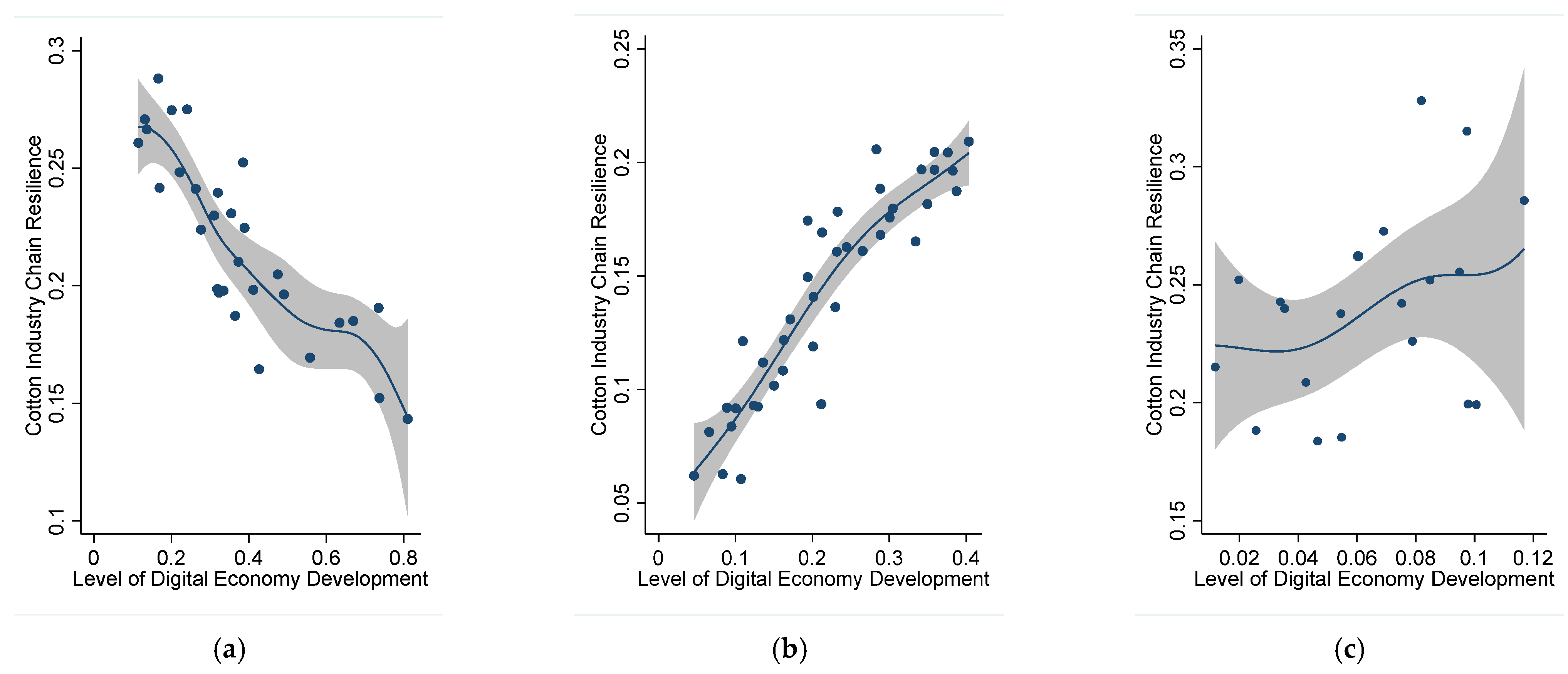 - There exists a significant nonlinear relationship between the digital economy and the resilience of the cotton industry chain. As the level of digital economy development increases, its promoting effect on the resilience of the cotton industry chain does not remain at a fixed intensity but rather exhibits characteristics of phased changes.