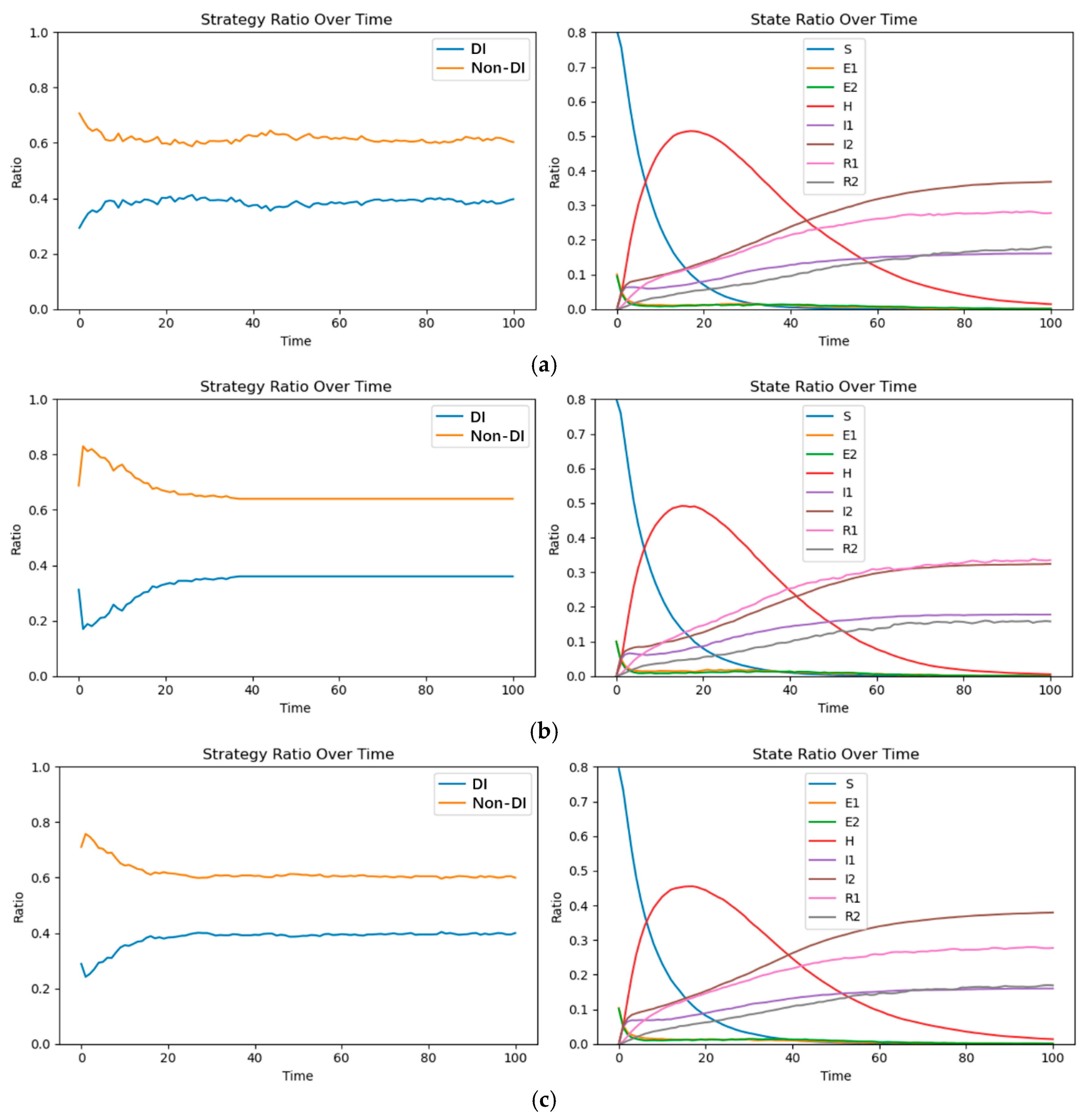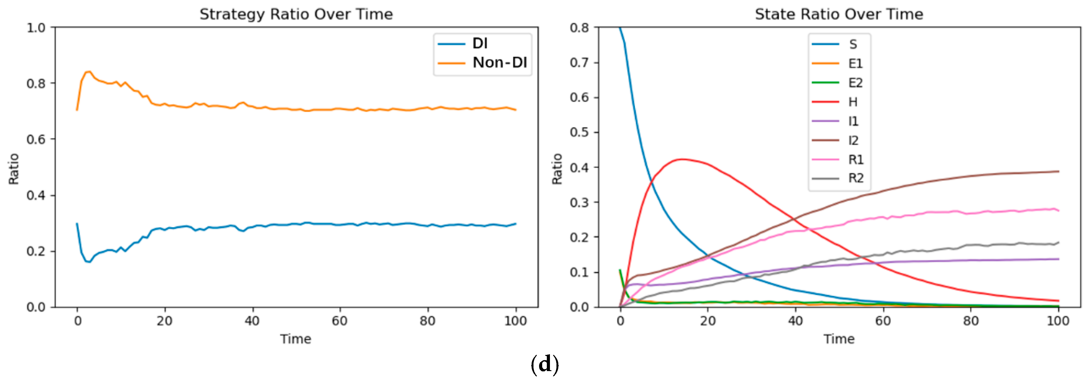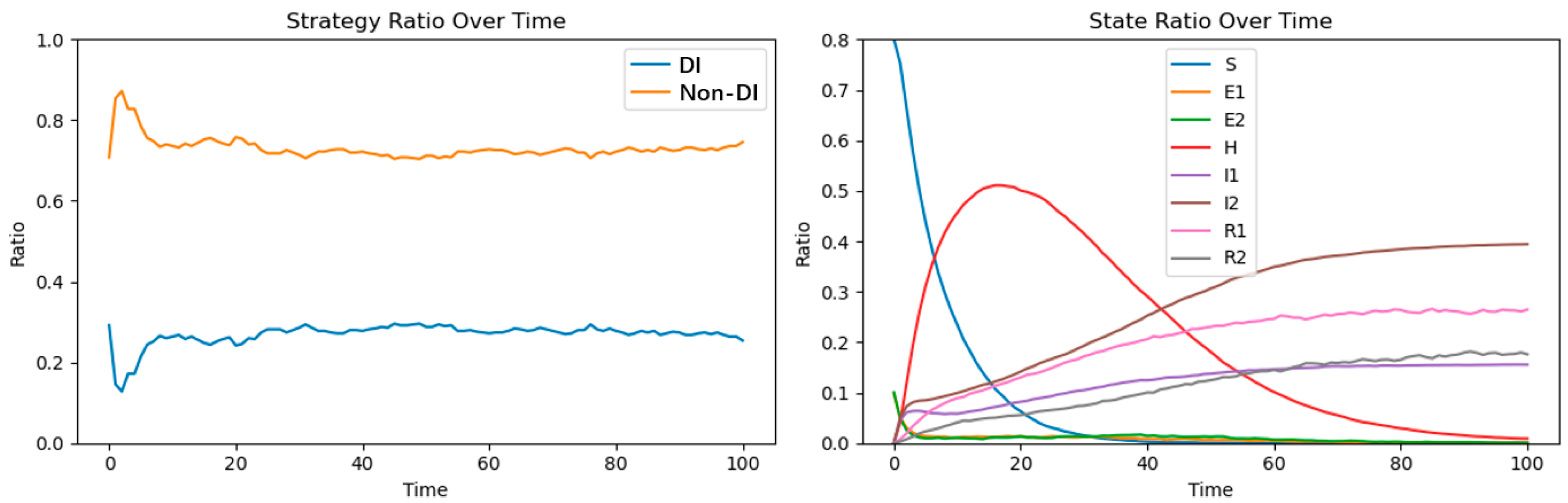 Figure 3 reports the baseline co-evolution trajectories of the enterprise strategy composition and consumer states under the initial parameter setting. The left panel shows that the share of DI-adopting enterprises increases rapidly in the early stage and then converges to a stable equilibrium slightly above 0.20, while the non-adopting strategy remains dominant. The right panel displays a consistent consumer diffusion pattern: the uninformed population declines sharply at the beginning, hesitation rises to a transient peak and then decays, and the disseminating and silent states gradually accumulate and stabilize. Taken together, the baseline simulation indicates that, given the initial incentives and network configuration, the coupled system converges to a low-adoption equilibrium for DI rather than a full-diffusion outcome.