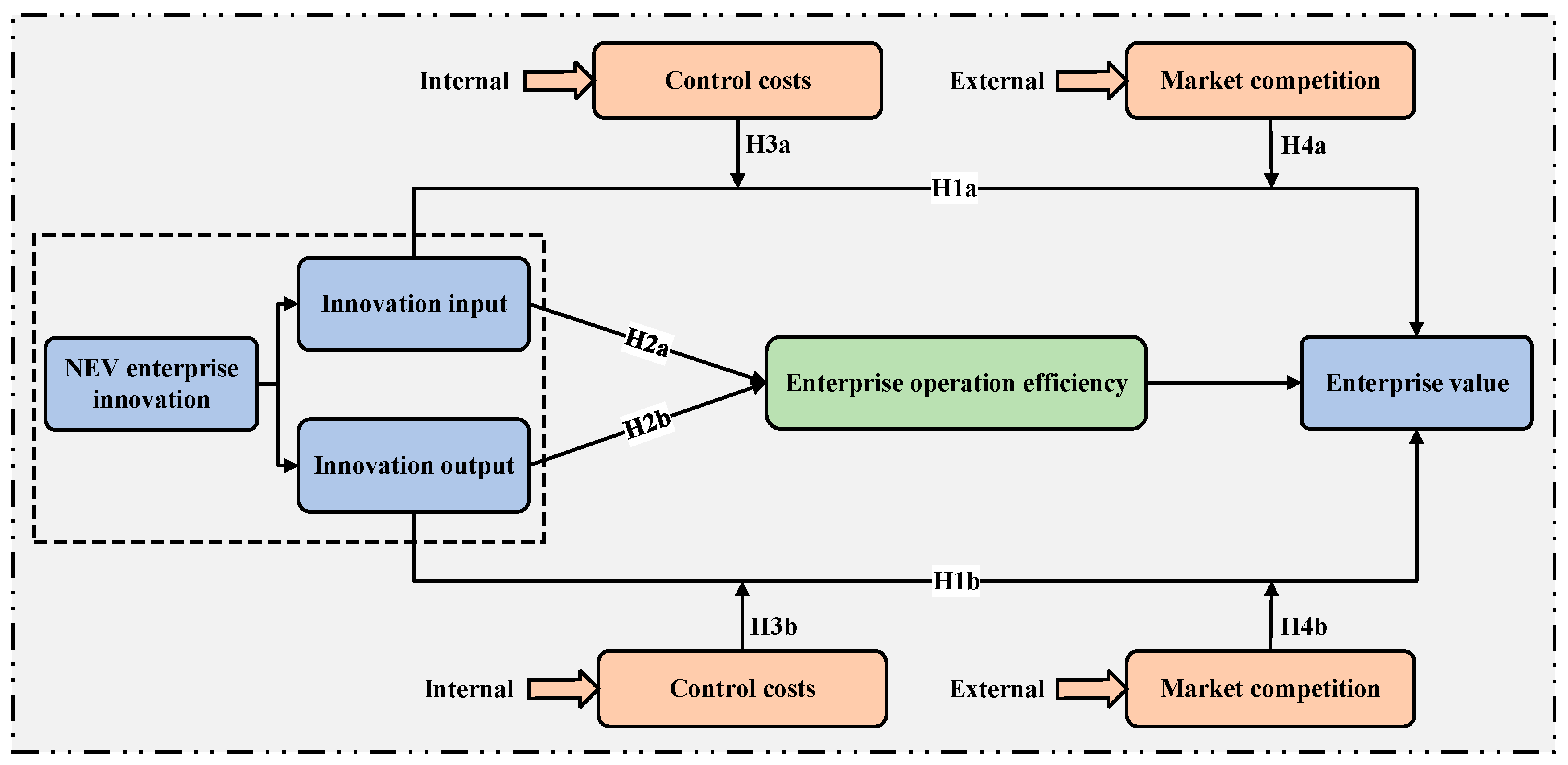 Despite extensive research on the impact of innovation on enterprise value, several issues remain. First, most studies focus on a single form of innovation, such as R&D expenditure or innovation mode, and pay limited attention to a systematic analysis of both innovation input and output, as well as the potential nonlinear effects of innovation input. Second, existing empirical studies are largely concentrated on traditional manufacturing industries or macro-level analyses, while firm-level evidence in the NEV sector remains scarce. NEV enterprises are characterized by high R&D intensity, long innovation cycles, and substantial technological uncertainty, which may cause innovation input to temporarily suppress enterprise value in the early stages before generating positive effects later. Finally, although previous research has suggested that operational efficiency, control costs, and market competition may influence the relationship between innovation and firm value, the combined effects of these internal and external factors in NEV enterprises have not been systematically examined. Building on these considerations, this study analyzes firm-level data from Chinese NEV listed companies, investigating the differential impacts of innovation input and output on enterprise value, the nonlinear characteristics of innovation input, the mediating role of operational efficiency, and the moderating effects of control costs and market competition. Based on this analysis, a theoretical research model is developed, as illustrated in