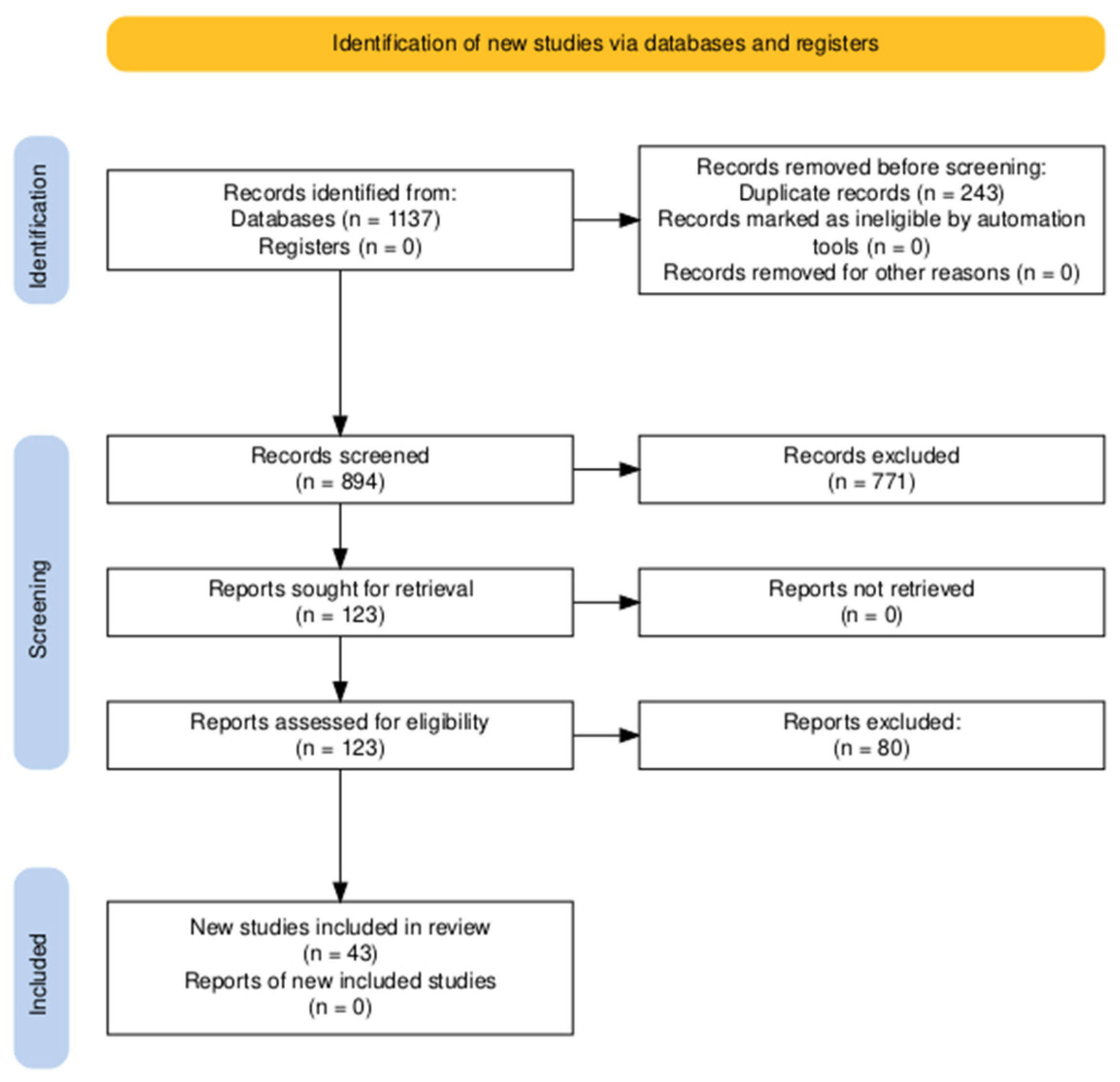 The initial search in the Scopus (n = 572) and WoS (n = 565) databases, based on the defined keywords, generated a total pool of 1137 records. Following the automated removal of duplicate records (n = 243) and primary screening of titles and abstracts, 771 articles were excluded for not meeting the thematic scope (e.g., studies outside the organisational context or lacking focus on managerial roles). The remaining 123 publications underwent a full-text eligibility assessment. At this stage, rigorous criteria for quality and relevance to the objectives of the systemic analysis were applied, resulting in the exclusion of a further 80 articles (primarily due to insufficient empirical data on causal relationships or a superficial treatment of systemic factors). The final sample consists of 43 highly relevant studies, providing the necessary depth for constructing the conceptual model, as presented in Appendix A. The visual representation of this process is illustrated via a PRISMA flow diagram (Figure 1), generated using the specialised PRISMA2020 R package and the Shiny app [55].
