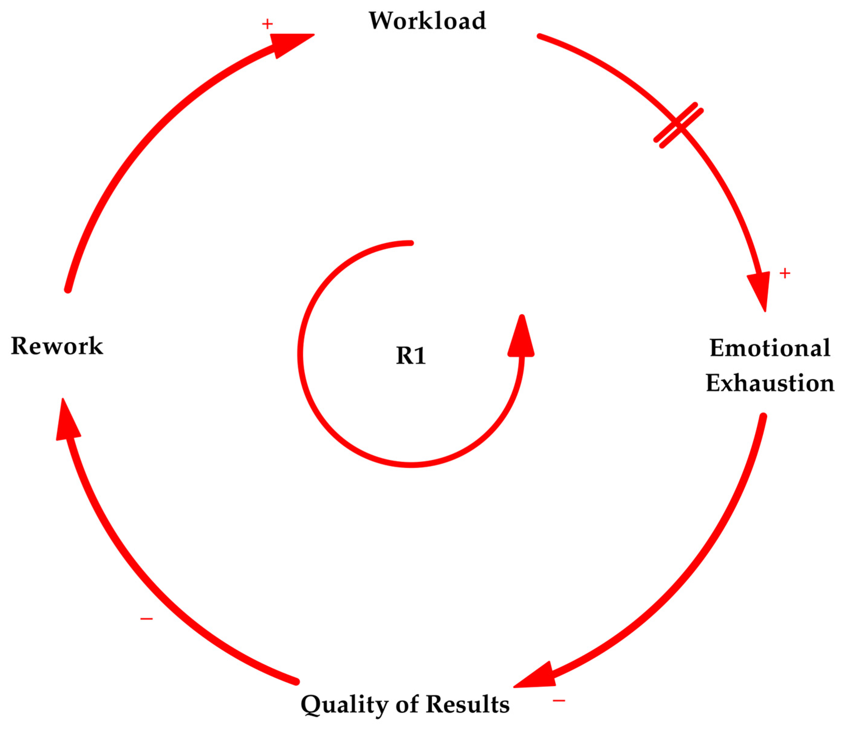 Figure 2. The Basic Burnout Causal Loop Diagram and the Chronic Exhaustion Cycle (R1). Source: Authors’ development.