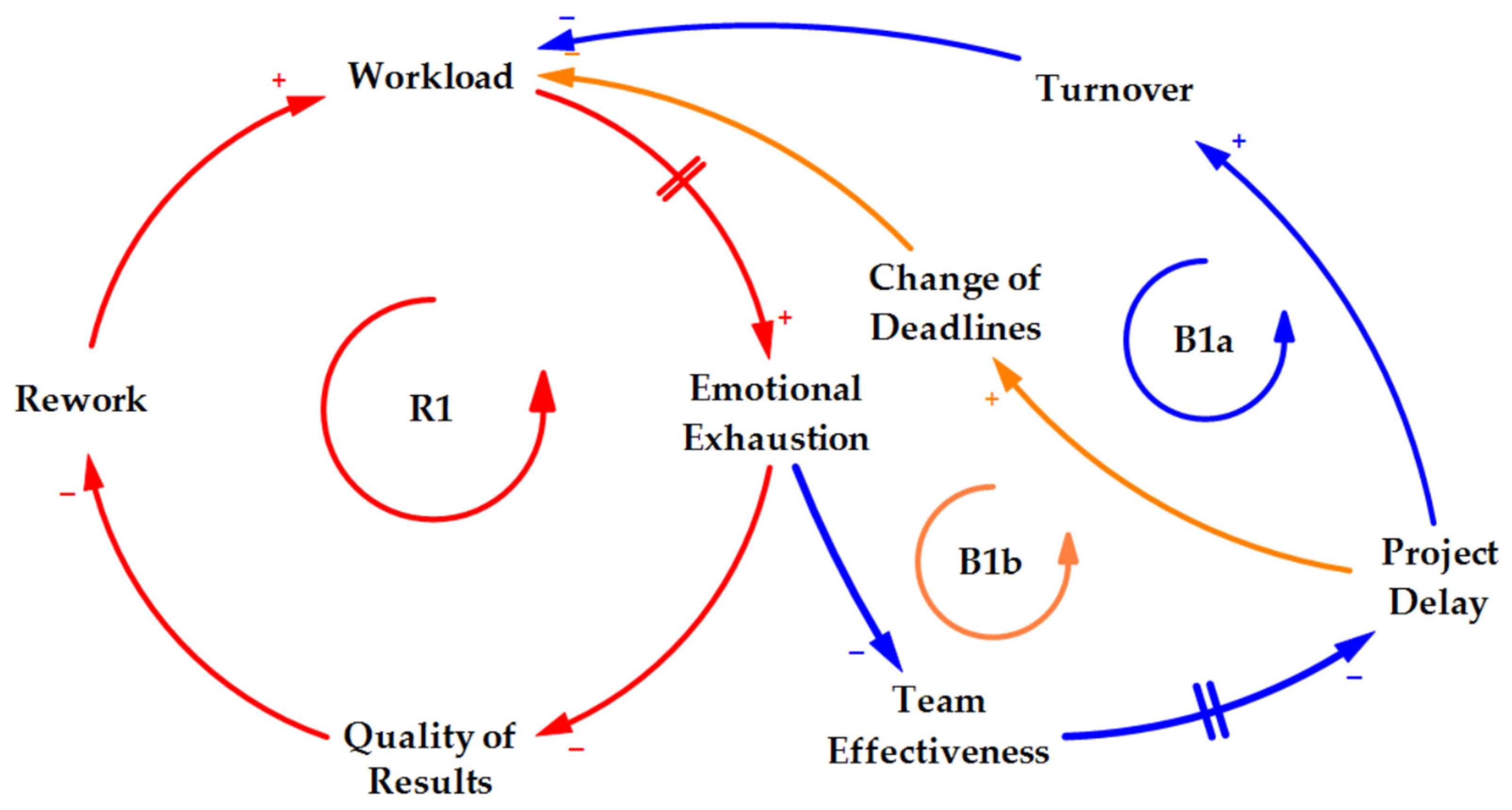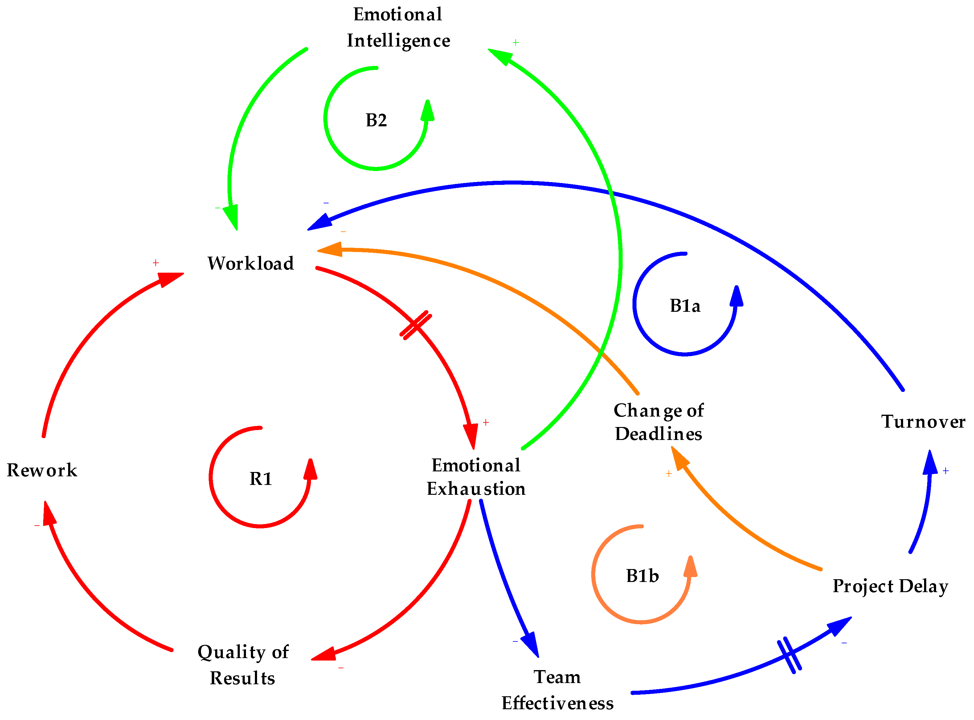 In this context, Emotional Intelligence (EI) emerges as a key, yet under-researched, resource for navigating uncertainty. Empirical data indicate that leaders with high EI employ more effective strategies for regulating team tension, acting as a stabilising factor in crisis situations [8,9]. From a System Dynamics (SM) perspective, the Project Manager’s EI can be viewed as a balancing control mechanism (Balancing Loop), capable of interrupting the self-reinforcing (amplifying) cycles of exhaustion [8,10].