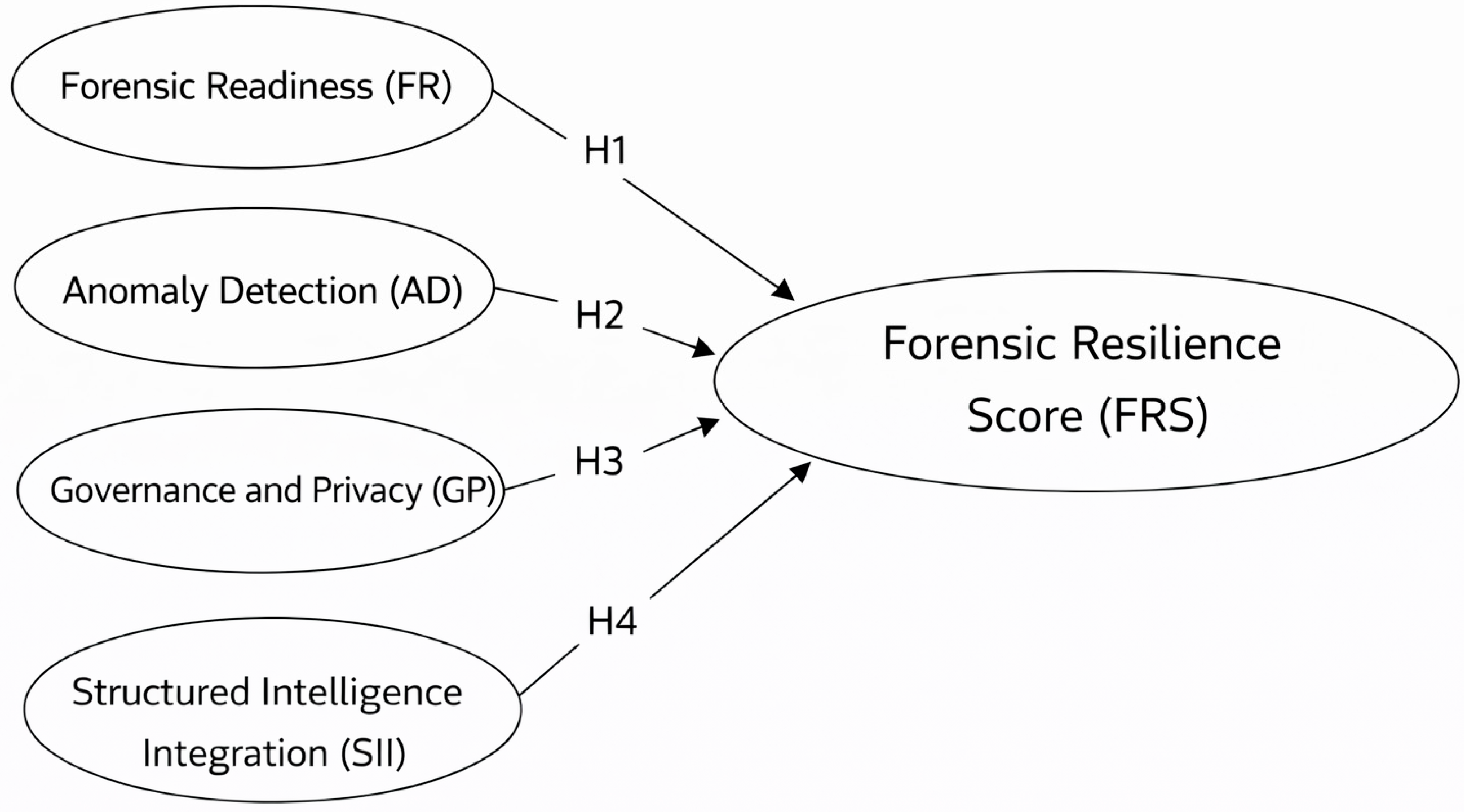 Each pillar—Forensic Readiness (FR), Anomaly Detection (AD), Governance and Privacy (GP), and Structured Intelligence Integration (SII)—is hypothesized to positively contribute to the composite Forensic Resilience Index (FRS). The dashed boxes (FSS and FL) represent theoretical extensions of the model. Accordingly, the following hypotheses are proposed for empirical validation:
