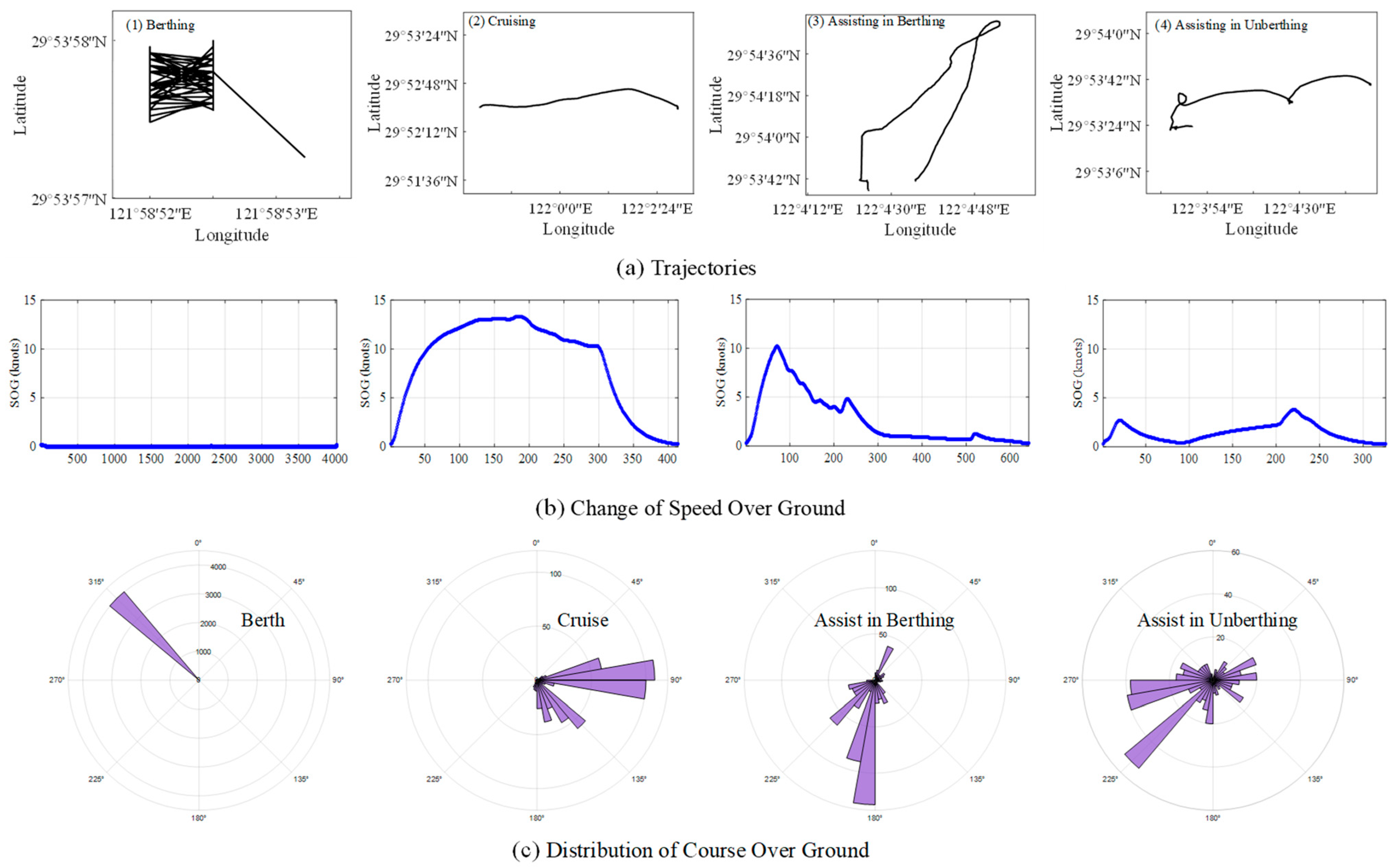 Figure 1, tugboat activities within the port environment can be categorised into four fundamental operational states based on motion characteristics and functional objectives: Berthing, Cruising, Assisting in Berthing, and Assisting in Unberthing. Each state displays distinct behavioural patterns in AIS trajectory data, as described below.
