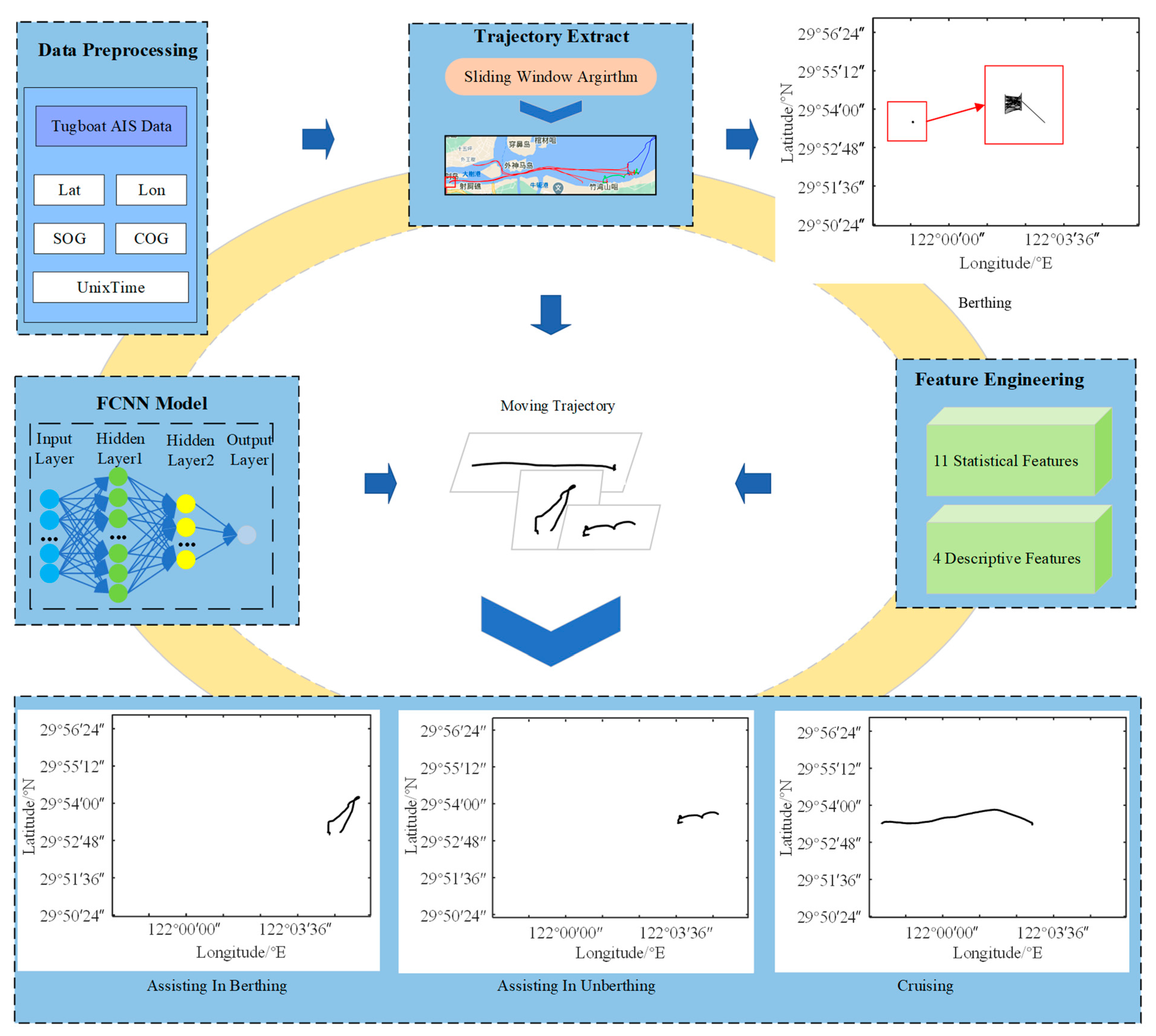 Step 3: Initial Classification: A three-layer fully connected neural network (FCNN) is employed to classify each sailing segment as either “Cruising” or “Assisting in Berthing/Unberthing.”