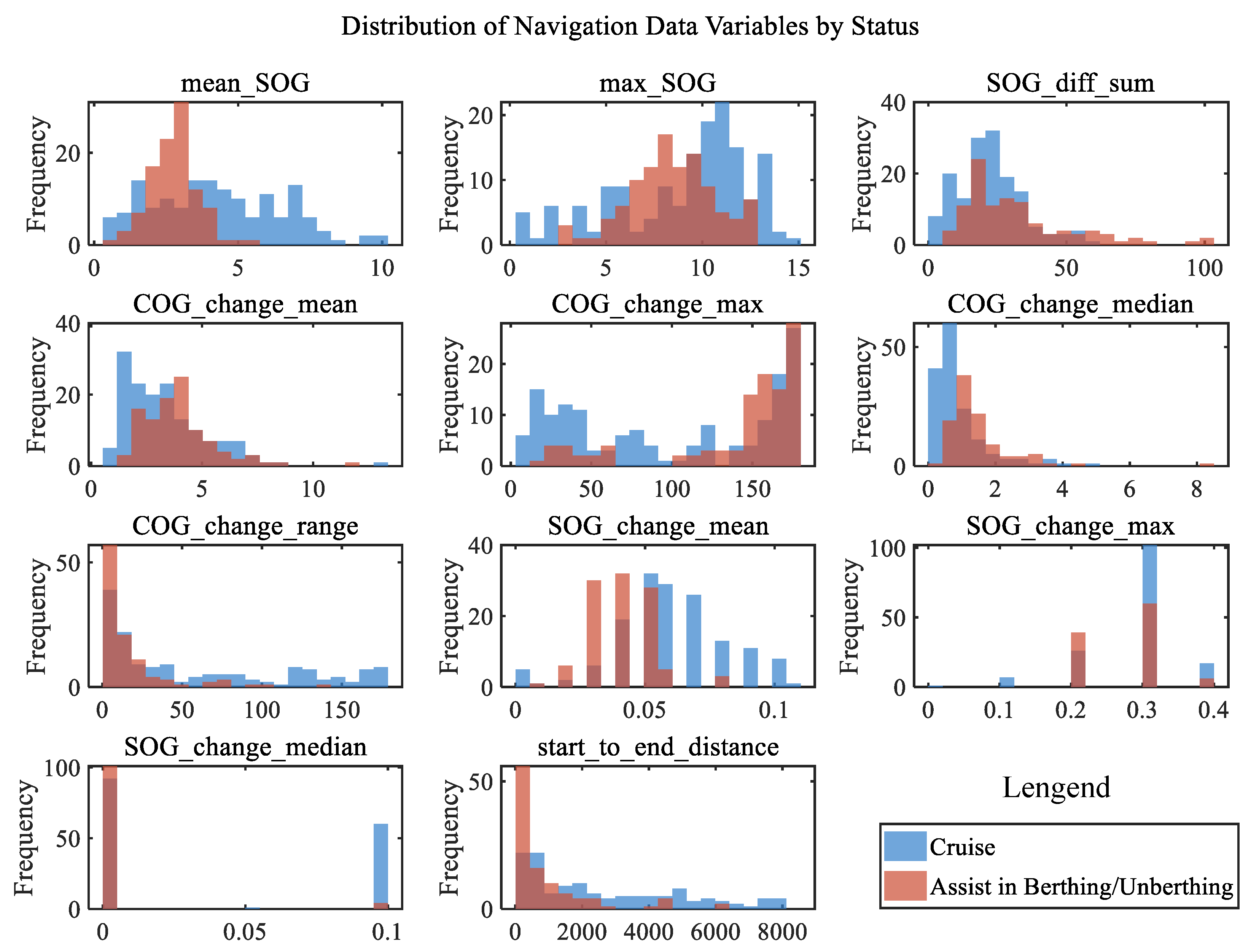 SOG_diff_ratio: Under Cruising conditions, this ratio exhibits a clear unimodal distribution with a peak around 0.5, corresponding to a typical accelerate–steady–decelerate speed pattern. In contrast, during Assisting in Berthing/Unberthing, the values are more dispersed and generally lower, reflecting the more complex and variable speed dynamics characteristic of close-range manoeuvring.