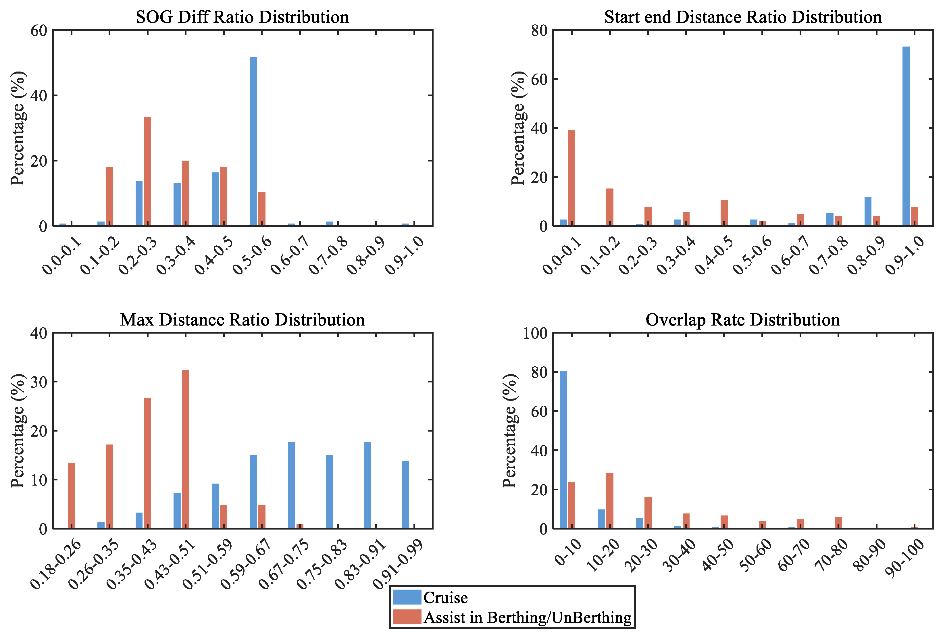 Start–End Point Distance Ratio: For Cruising, this ratio is concentrated around 1.0, indicating nearly linear movement. By comparison, during Assisting in Berthing/Unberthing, the ratio predominantly falls within the 0.2–0.6 range, clearly capturing the characteristic zigzag behaviour.