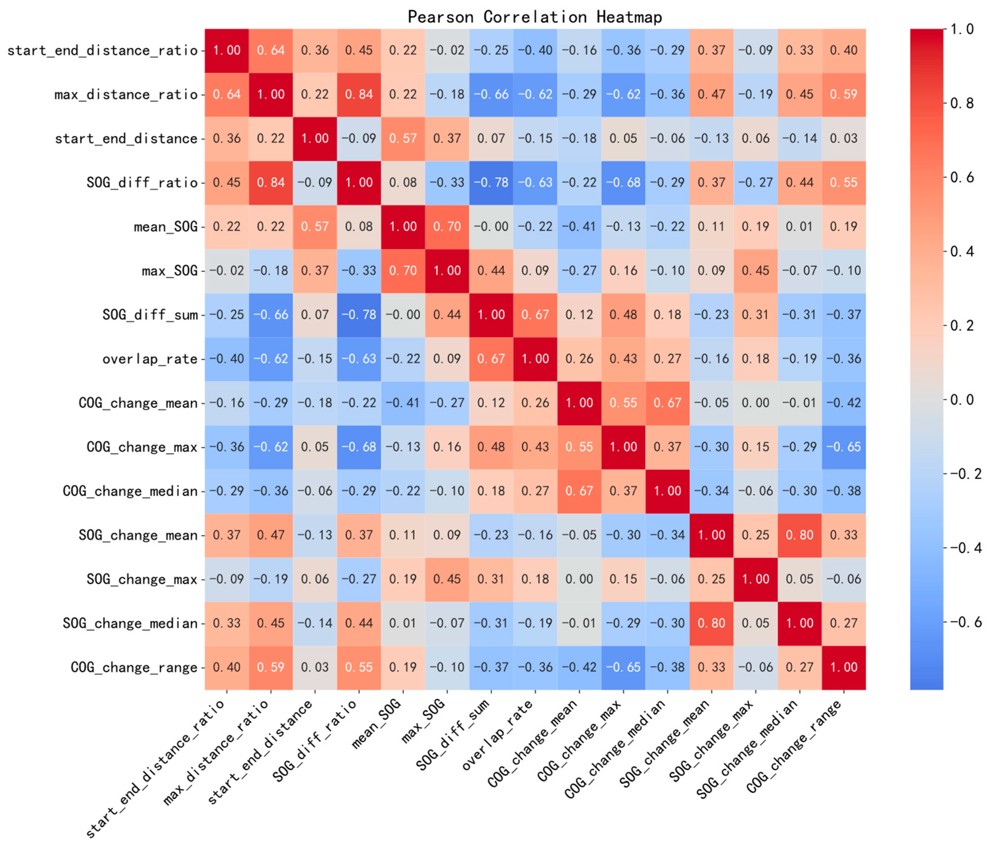 Kinematic Redundancy: High positive correlations are observed among certain SOG-related indicators. For instance, SOG_diff_ratio and max_distance_ratio show a correlation coefficient exceeding 0.8. While this indicates information redundancy regarding speed dynamics, the FCNN model effectively mitigates the risk of overfitting through the application of L2 regularisation.
