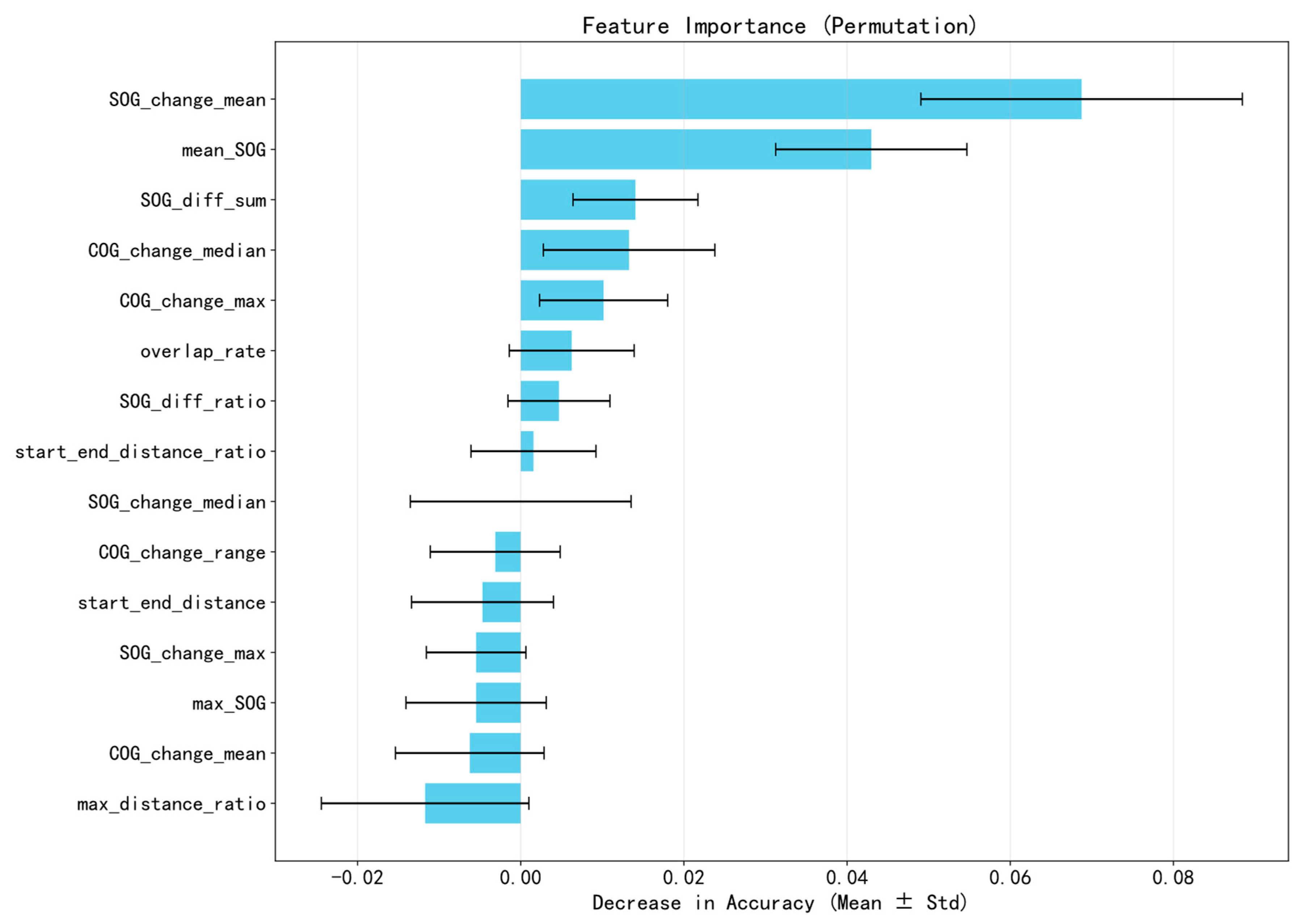 Dominance of Temporal SOG Dynamics: The results indicate that SOG_change_mean and mean_SOG are the most critical predictors. Permuting these features leads to the most significant degradation in accuracy (approximately 4–6%). This suggests that the deep learning model primarily distinguishes “Cruising” from “Assistance” by learning the temporal dynamics of SOG—specifically, the contrast between stable high-speed transit and fluctuating low-speed maneuvering.