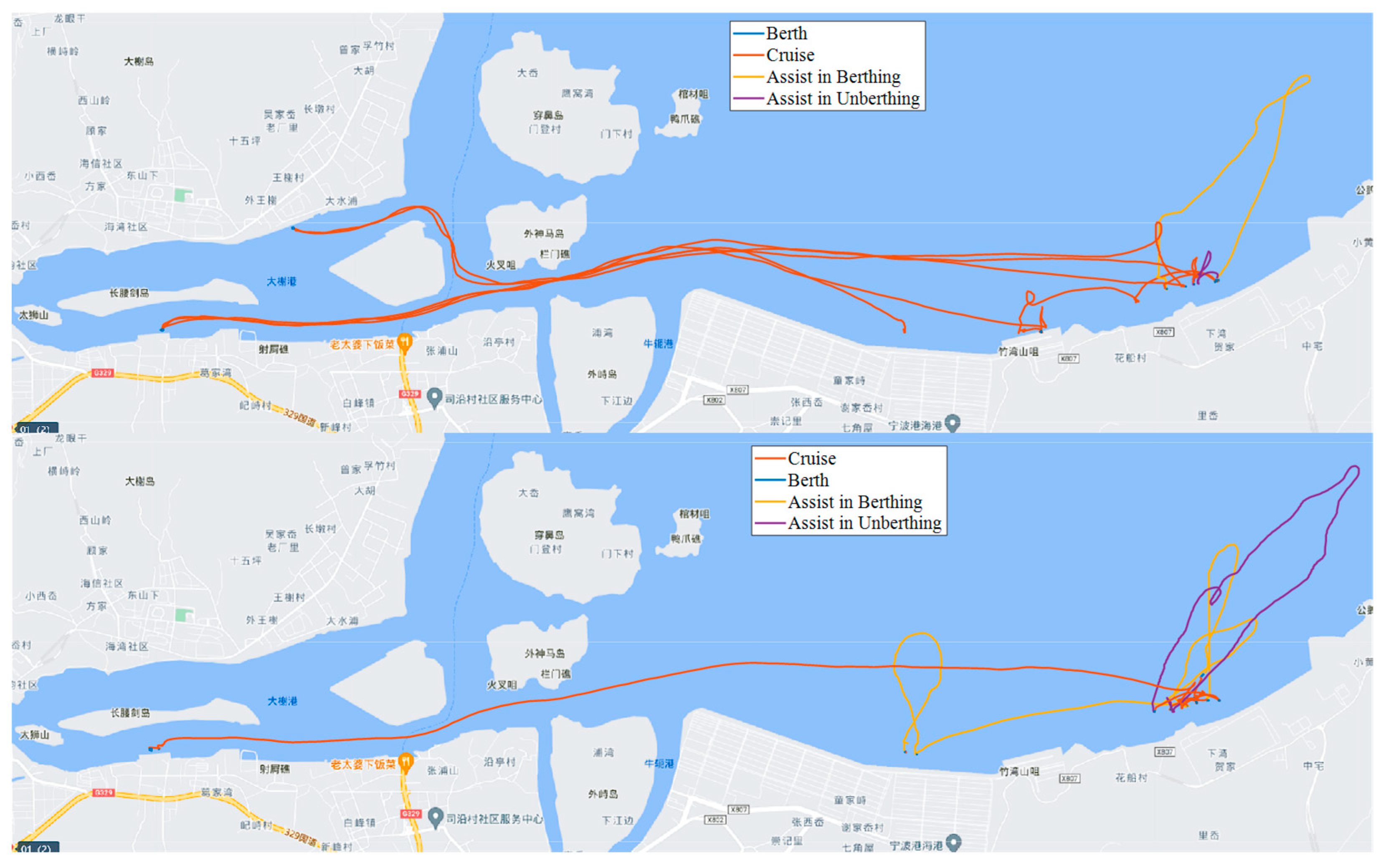 Assisting in Berthing (yellow) and Assisting in Unberthing (purple) trajectories cluster in waters adjacent to wharves and display dense zigzag patterns characteristic of tugboats performing close-range manoeuvring.