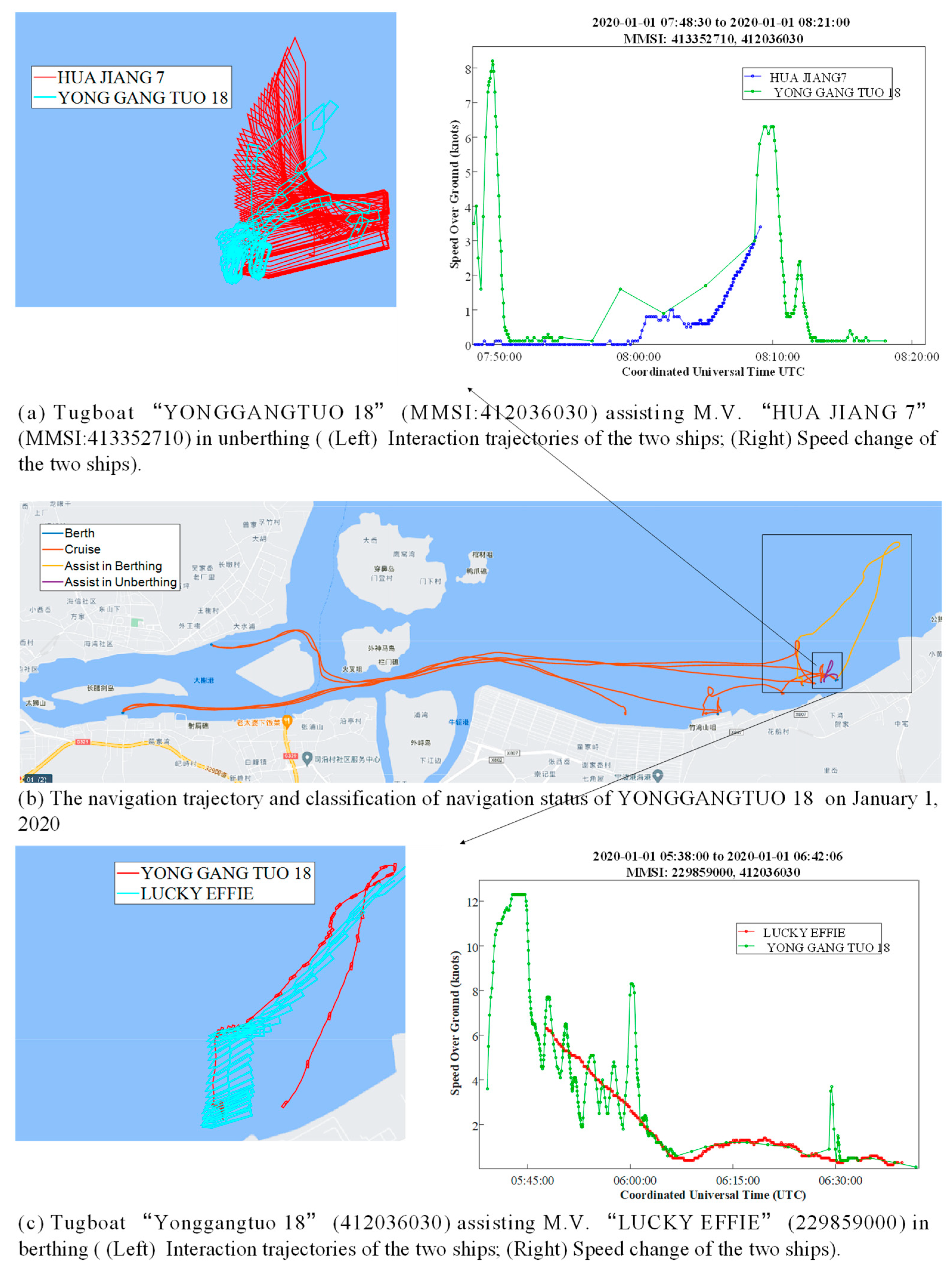 Based on the “assisting in berthing/unberthing” category output by the FCNN, a further distinction between assisting in berthing and assisting in unberthing is made using dynamic speed characteristics: