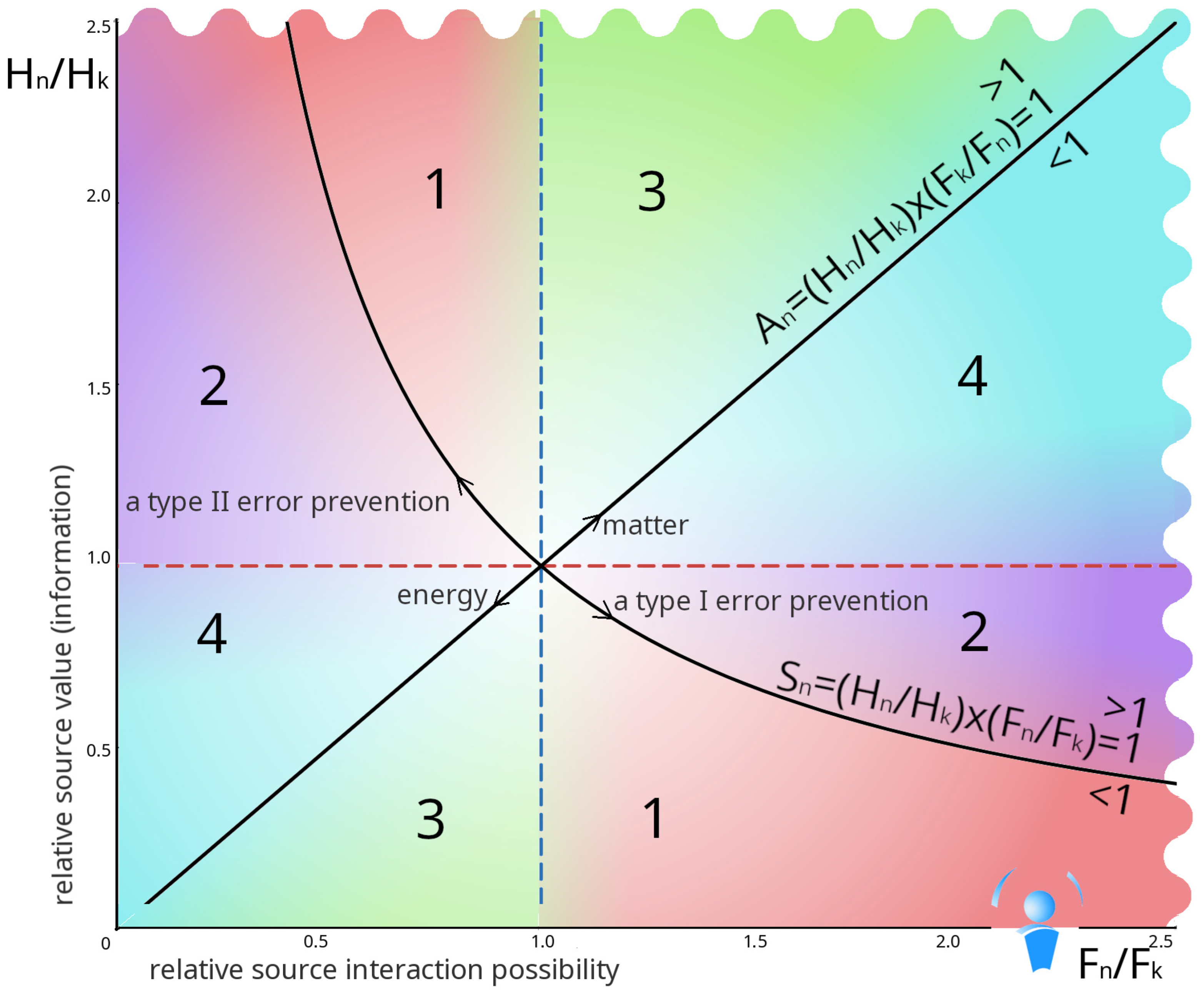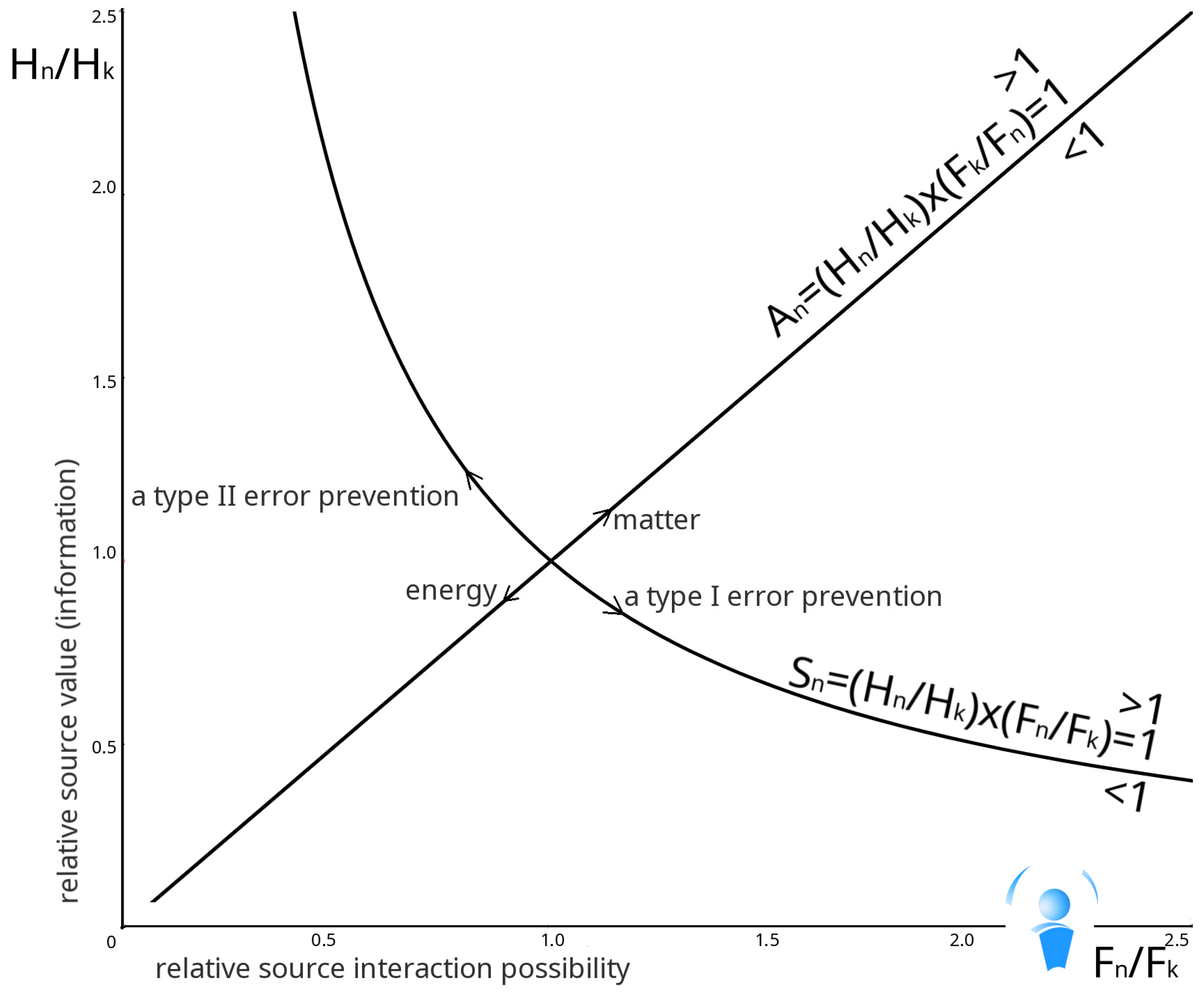 Accordingly, the main “body” of the system predominantly consists of those resources for which An > 1, regardless of whether they are stable matter or energy stored in relatively unstable matter. Then the second resource, which requires less accumulation, will be invested relatively quickly into the new structure of the system, using reserves of the second resource that enable rapid use. It can be said that for resources with a relative characteristic An > 1, it is more important not to miss sources of relatively less abundant resources when they appear, that is, to avoid committing a statistical error of the type I error. In this case, it is not so important that some other resources will be spent on erroneous actions by the system. In other words, there is a priority on gaining benefits with greater tolerance for potential losses. Then, for resources with a relative characteristic An < 1, it is more important to avoid wasting other resources without obtaining this relatively redundant resource. In this case, it is more important to avoid committing a statistical type II error. Still, it is not so important if some resource sources with a relative characteristic An < 1 are also missed. In other words, there is a priority on reducing losses rather than on gaining potential benefits.