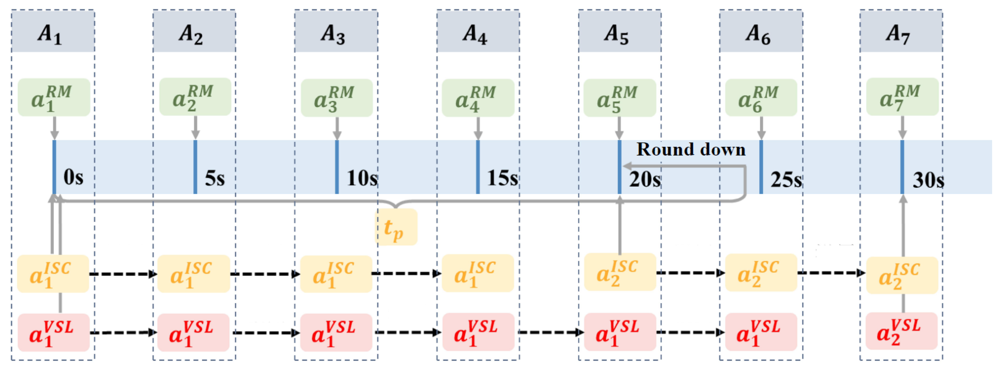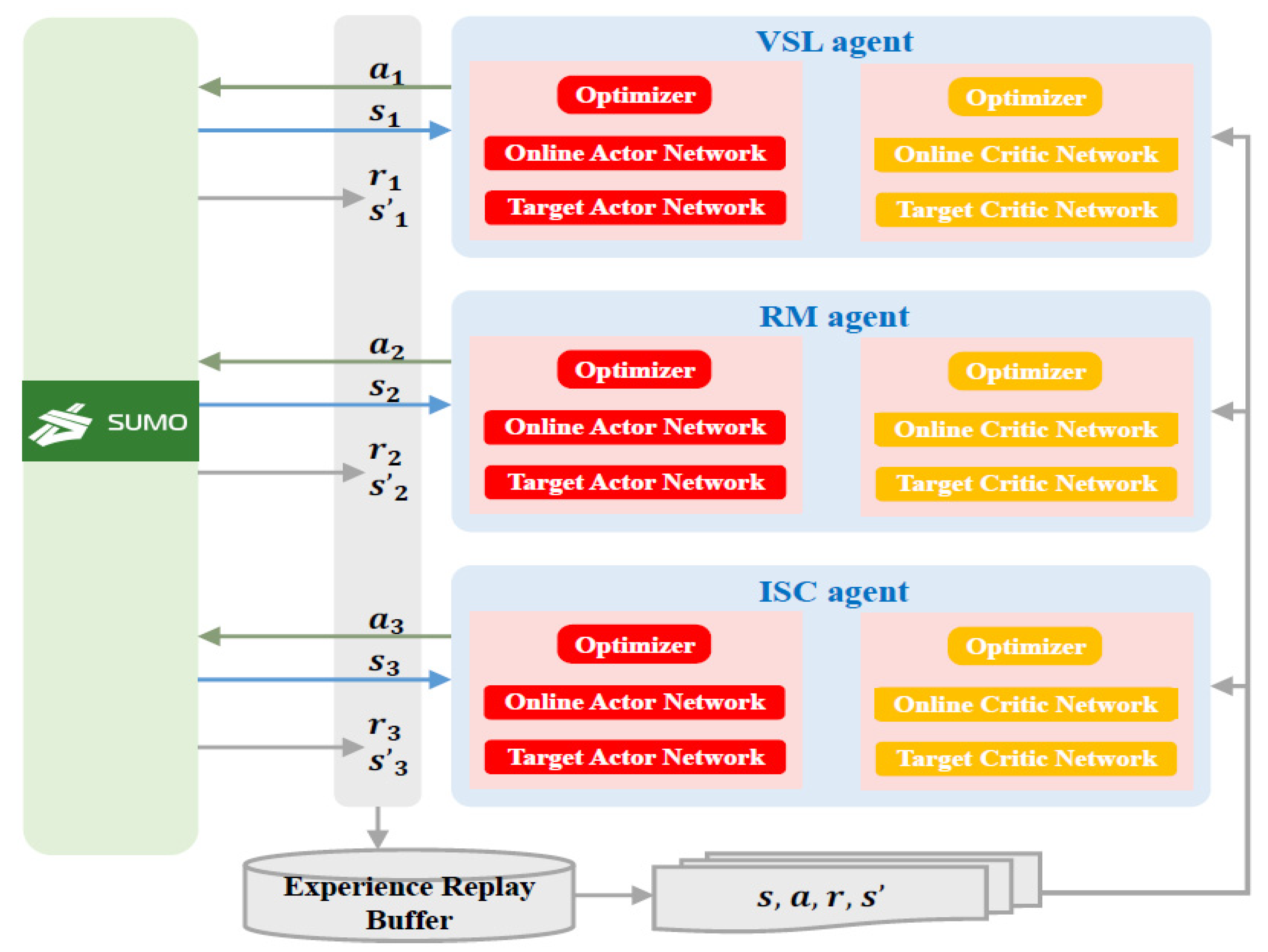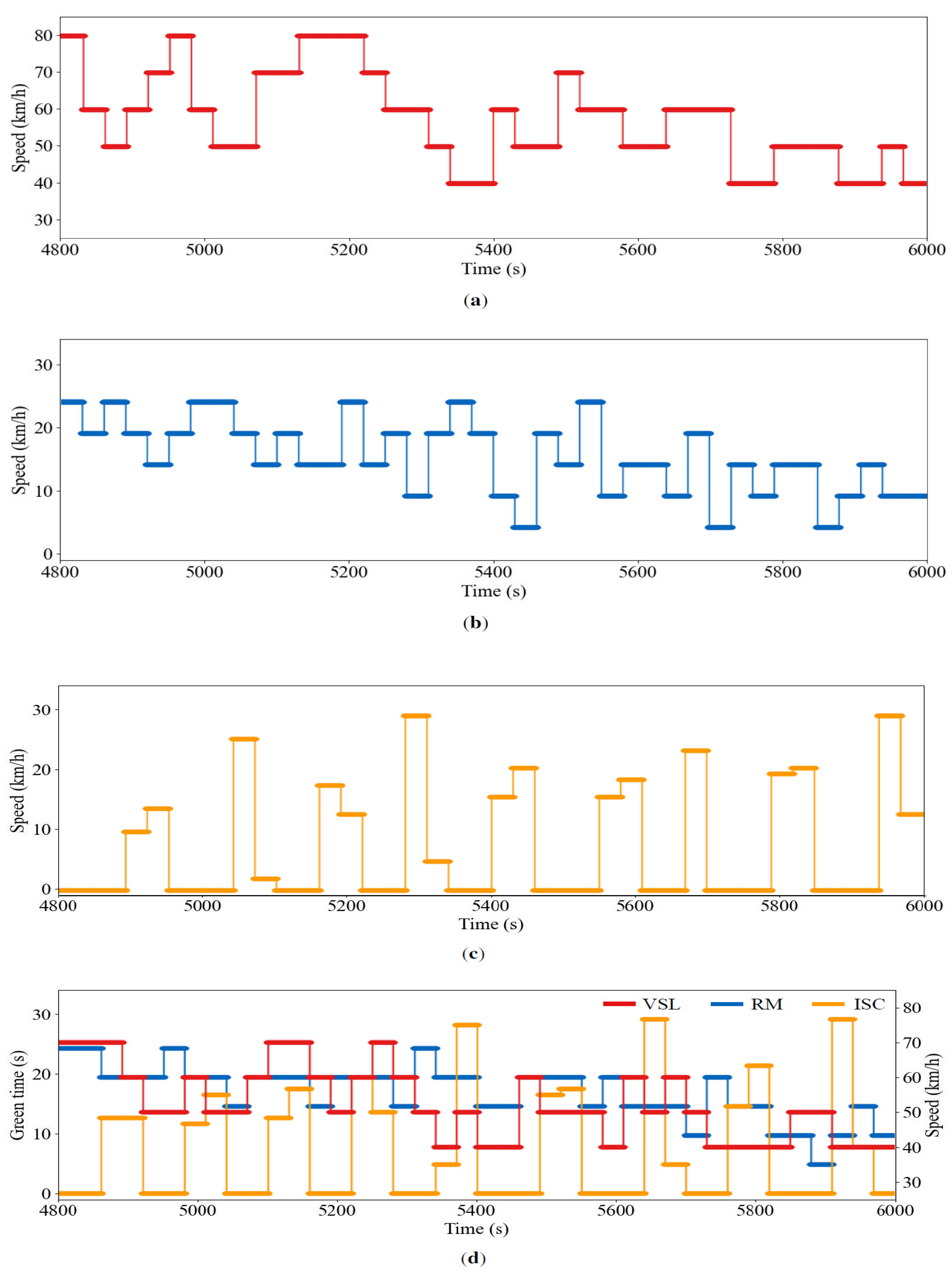 - Asynchronous control cycle coordination. VSL, RM, and ISC agents operate on heterogeneous cycles (30 s, 5 s, and 10–50 s, respectively), aligned on a unified 5 s grid with an action-holding mechanism. Here, the 5 s grid refers to the global scheduling/communication tick used for state aggregation and due-check, not the signal cycle length; the ISC cycle remains 10–50 s through phase holding, while decisions are synchronized to the 5 s grid by action holding and time quantization. This avoids unnecessary updates while preserving feasibility constraints such as minimum green times and legal speed limits.