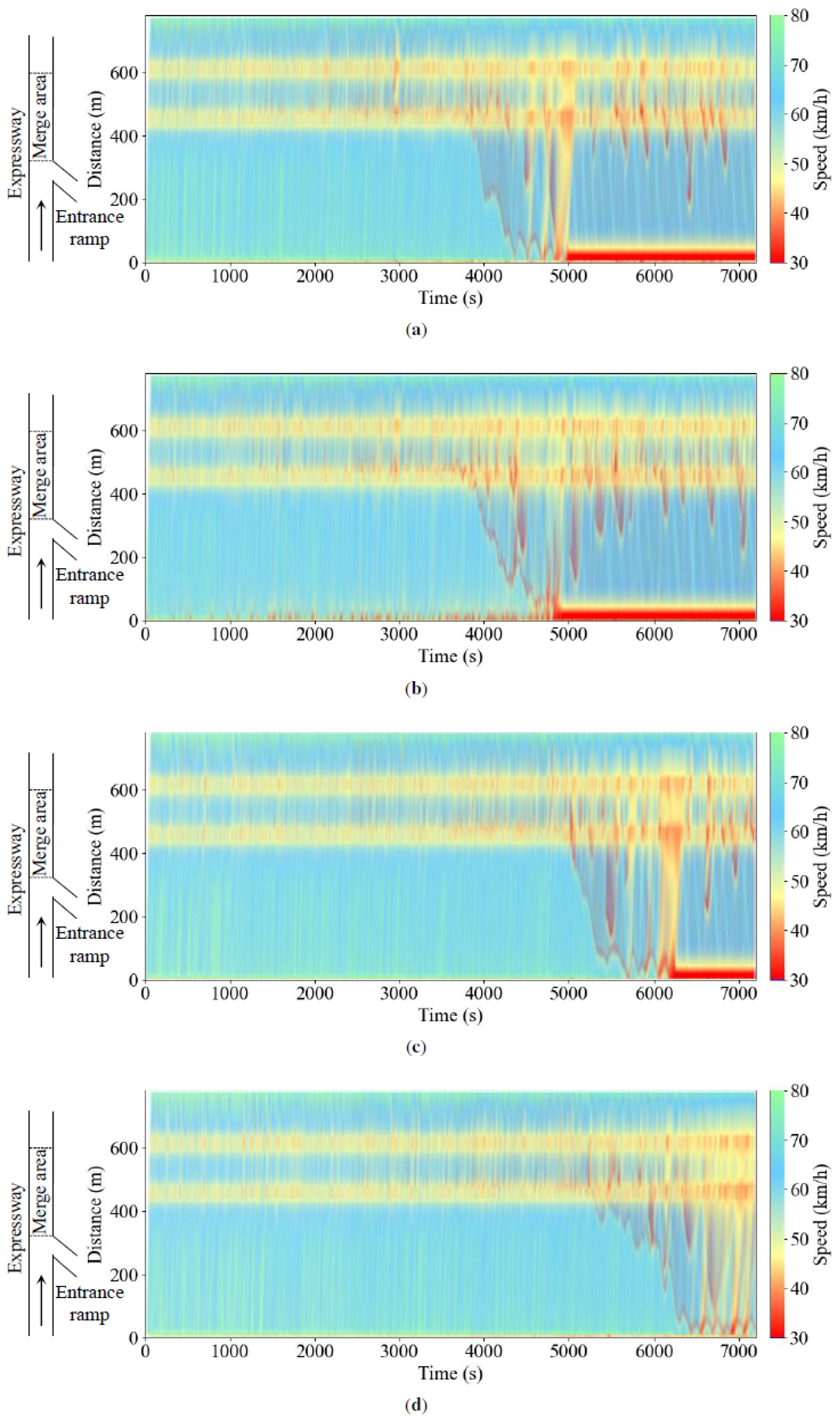 - Peng, T.; Xu, X.; Li, Y.; Wu, J.; Li, T.; Dong, X.; Cai, Y.; Wu, P.; Ullah, S. Enhancing expressway ramp merge safety and efficiency via spatiotemporal cooperative control. IEEE Access 2025, 13, 25664–25682. [Google Scholar] [CrossRef]