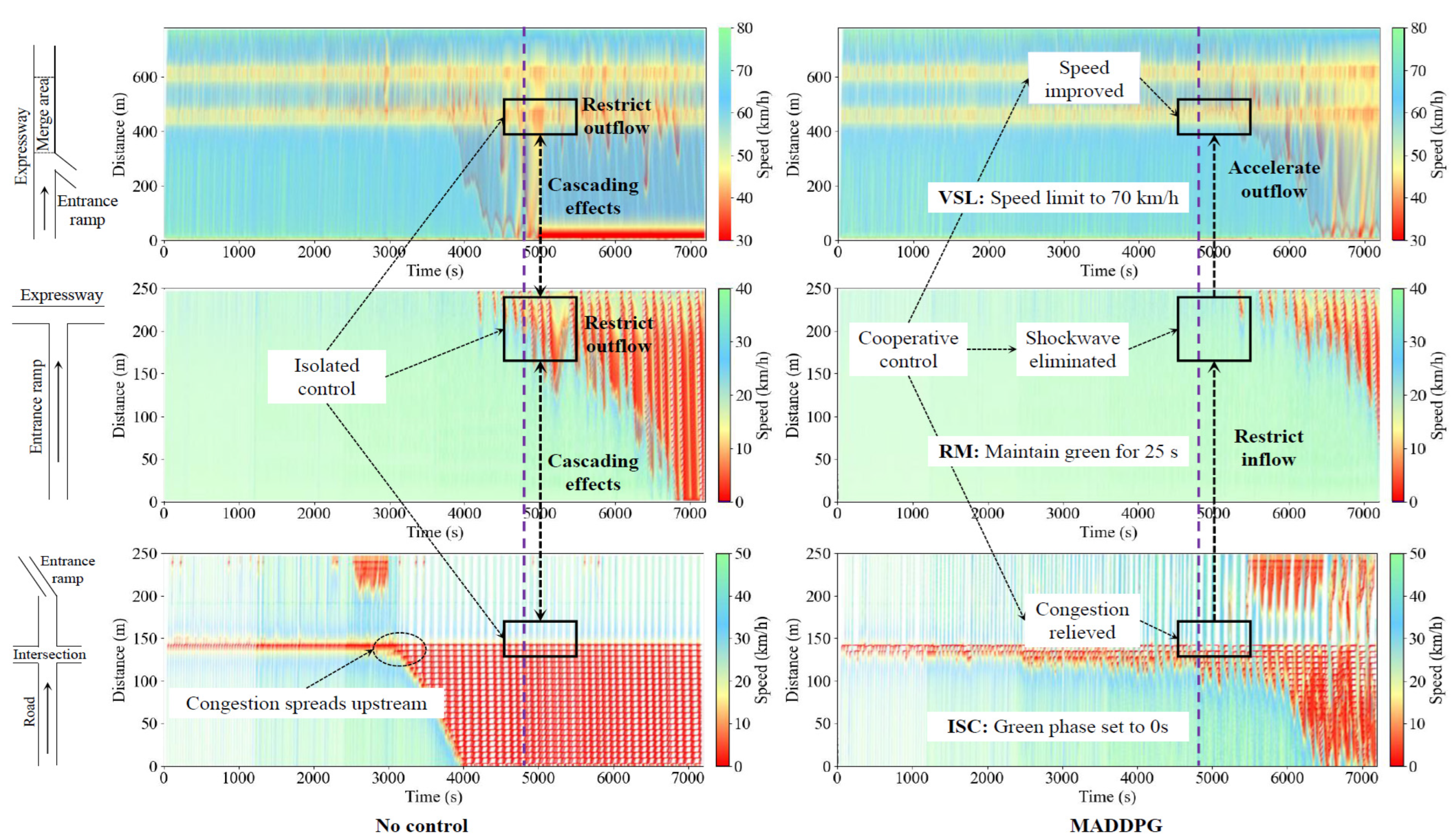 - No spillback: Penalizing enforces storage limits at ramps/junctions; when queues rise, ISC prioritizes discharge (longer greens) and/or RM tightens inflow (shorter greens) to avert spillback.