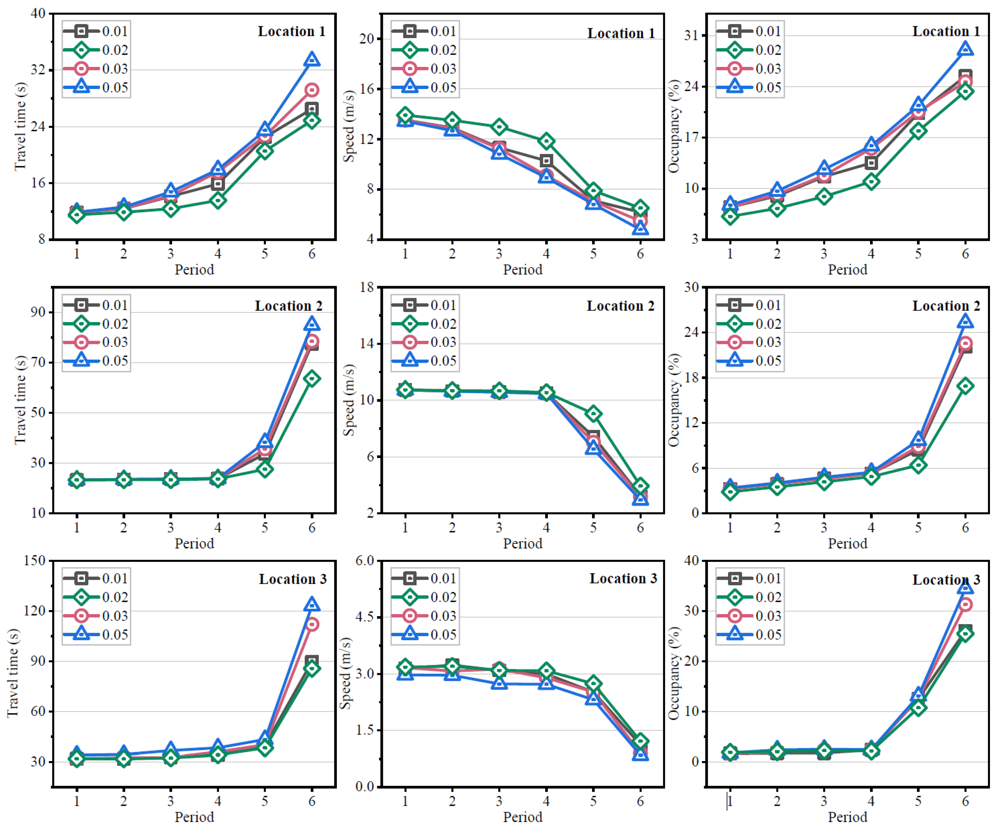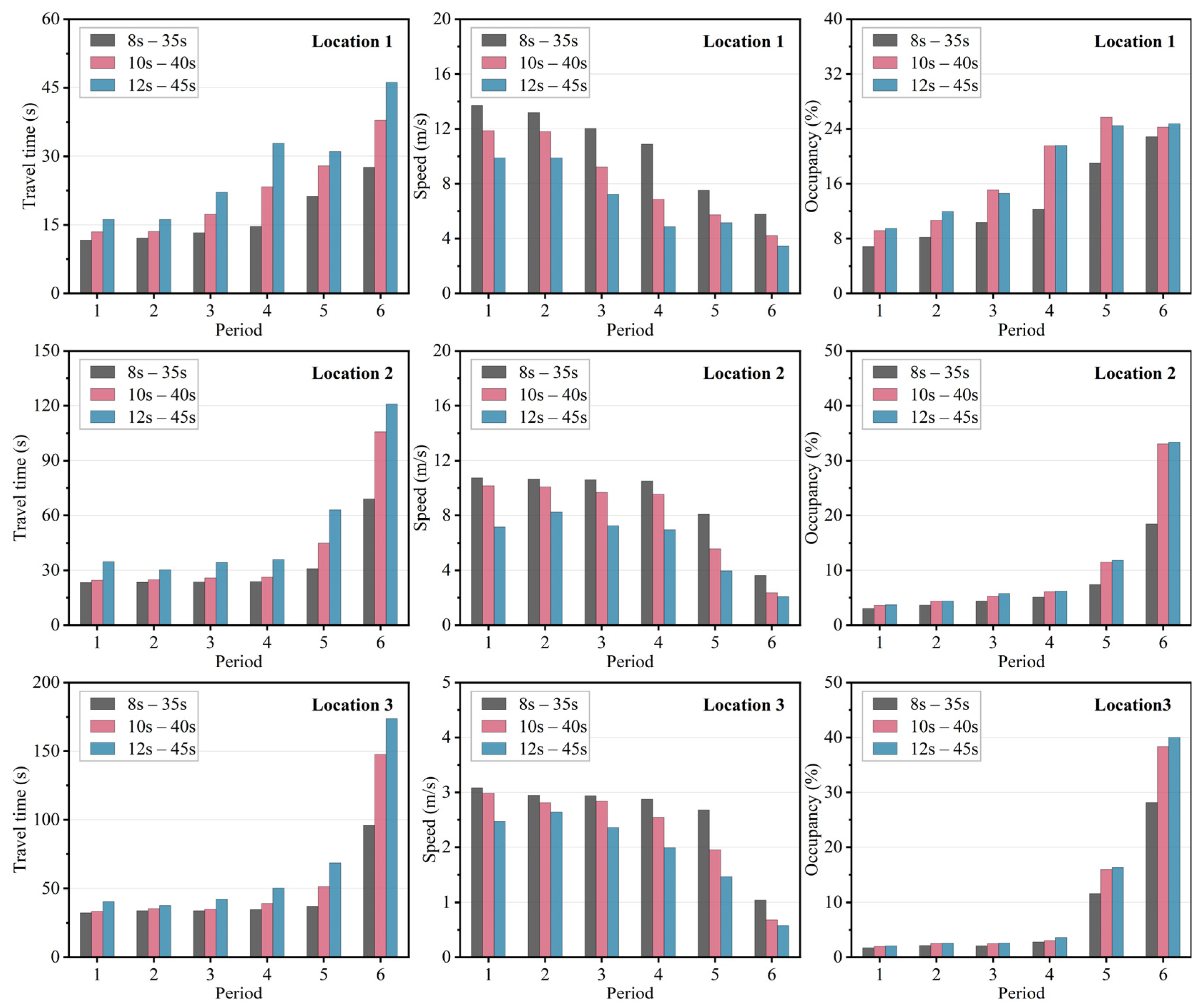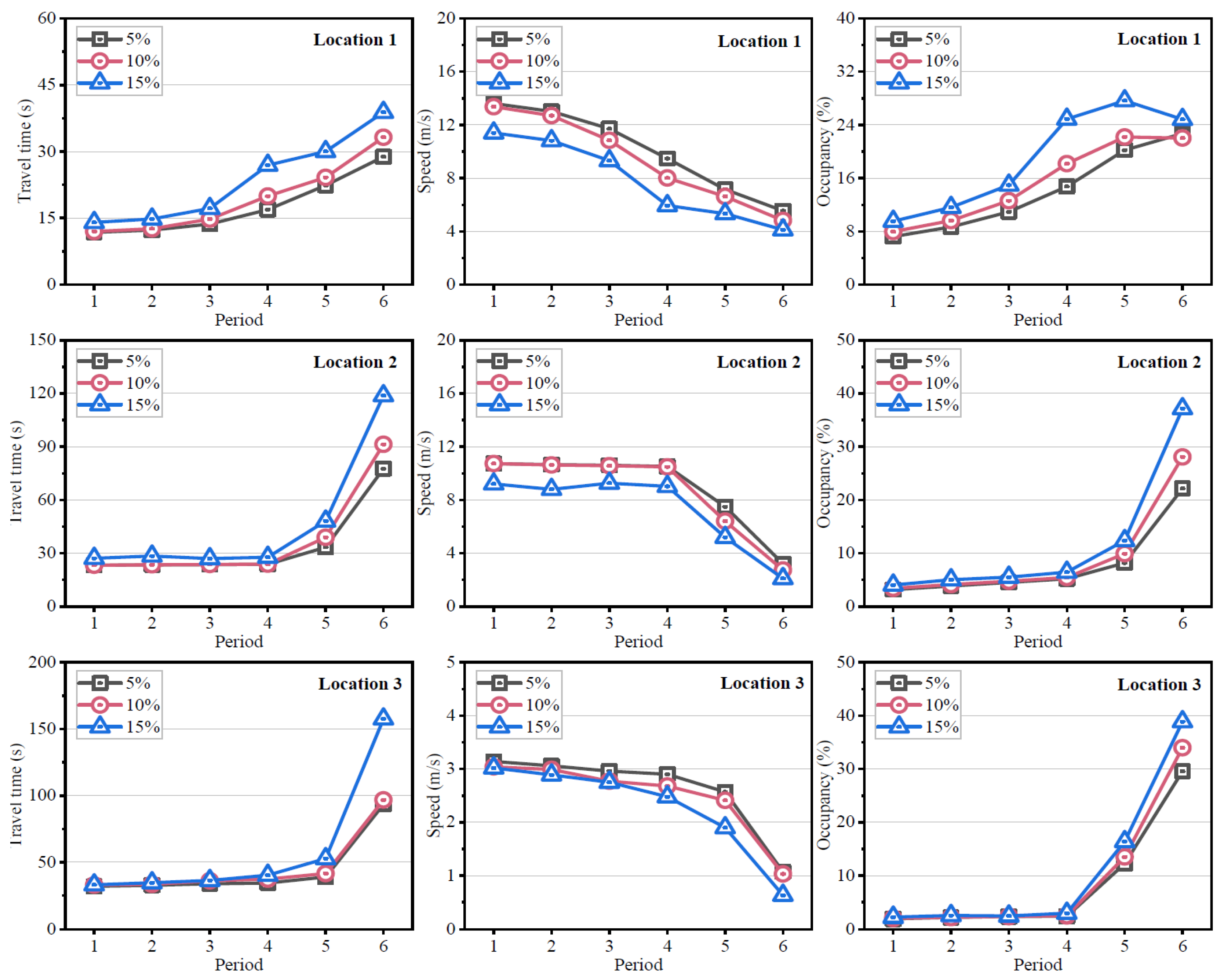 | Time (min) | Flow (veh/h/lane) | Travel Time (s)/Speed (m/s)/Occupancy (%) | ||