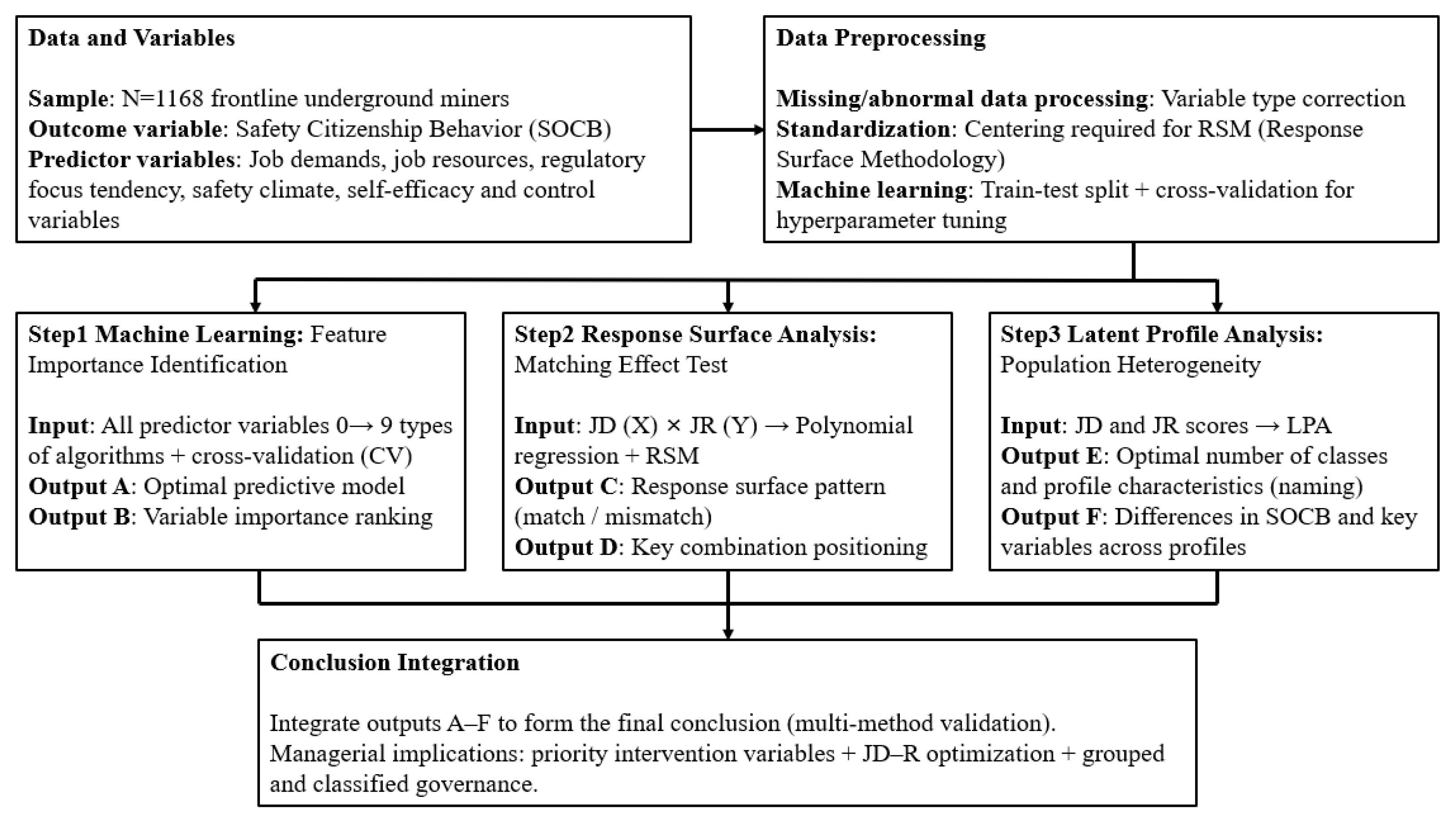 In this section, an exploratory latent profile analysis (LPA) approach was adopted for the data, followed by univariate and multivariate regression analyses to examine the predictive power of the identified latent profiles on other variables. Building on the overall research, a refined analysis was conducted by classifying miners based on their different scores on job demands and job resources to identify the job characteristic profiles of the miner groups.