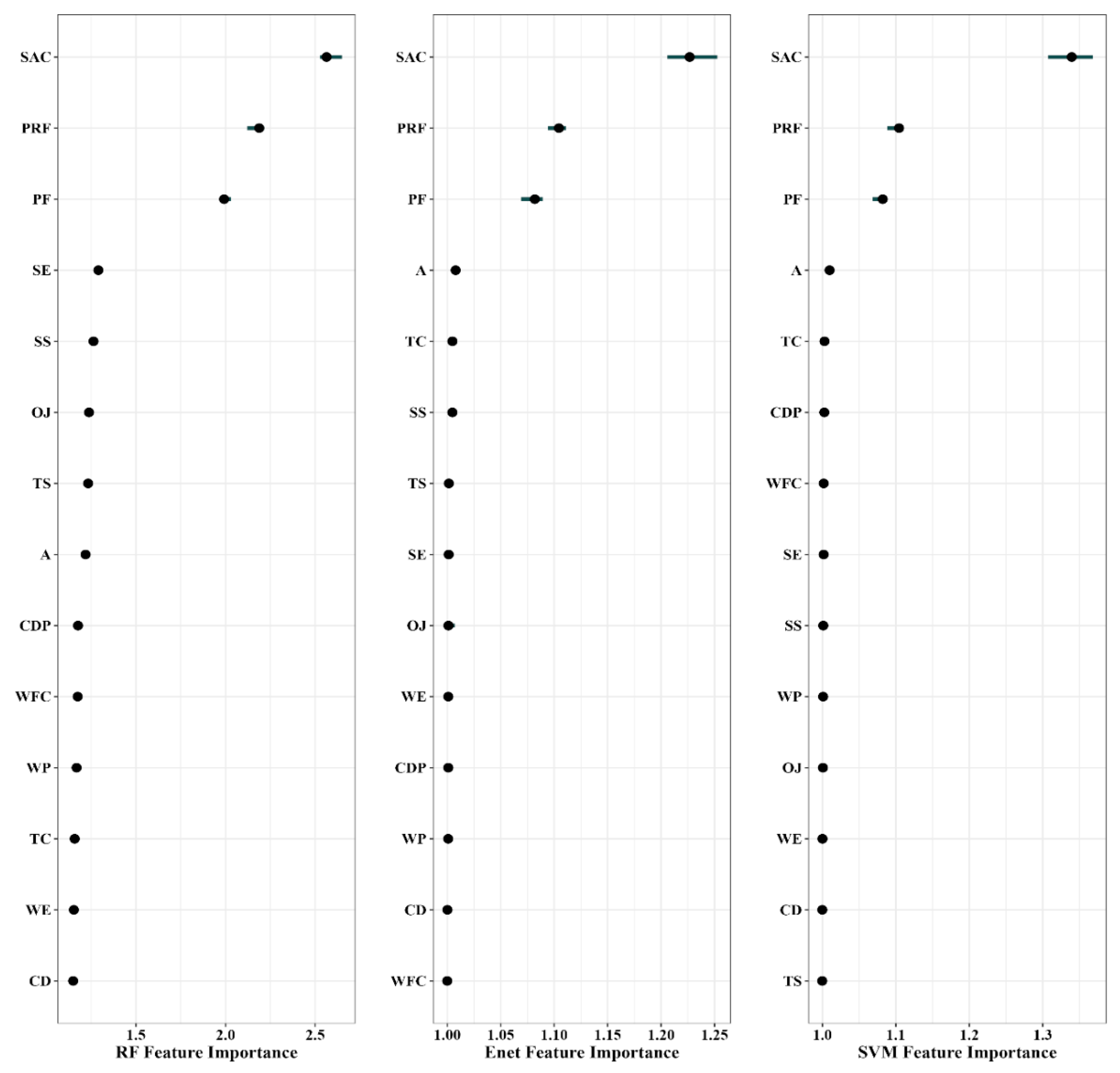 Variable feature importance visualization was performed for the three machine learning models with the best predictive performance—Random Forest (RF), Lasso Ridge Regression Elastic Net (ENet), and Support Vector Machine (SVM)—to intuitively evaluate the relative impact of the included variables on safety citizenship behavior. A higher variable feature importance value indicates a greater contribution of the variable to the prediction of safety citizenship behavior.