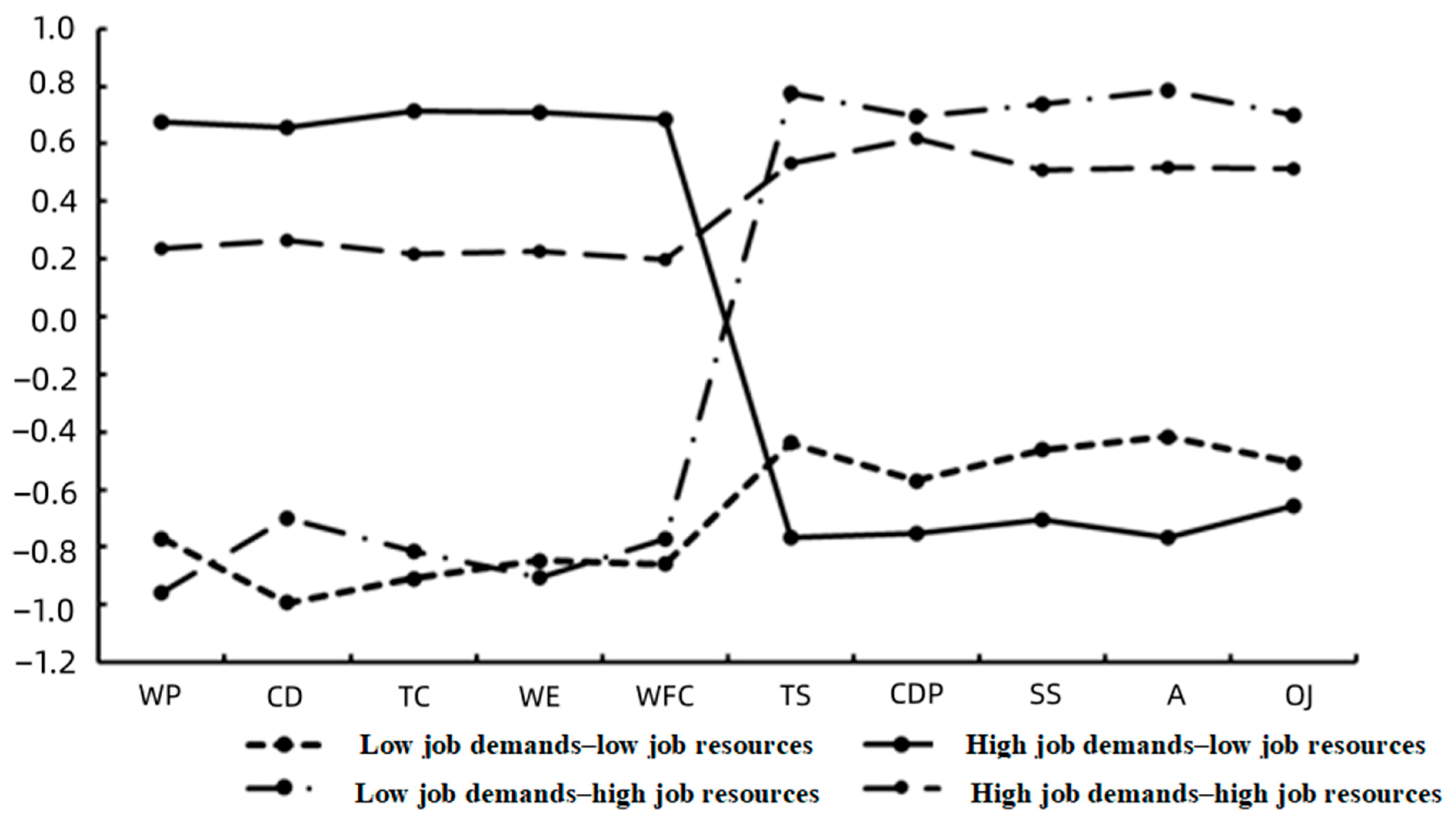 Table 8, Profile 1, where both job demands and job resources scores were low, was named Low Job Demands–Low Job Resources, consisting of 225 samples (19.26%); Profile 2, characterized by high job demands scores and low job resources scores, was named High Job Demands–Low Job Resources, consisting of 348 samples (29.8%); Profile 3, with low job demands scores and high job resources scores, was named Low Job Demands–High Job Resources, consisting of 440 samples (37.67%); and Profile 4, where both job demands and job resources scores were high, was named High Job Demands–High Job Resources, consisting of 155 samples (13.27%).