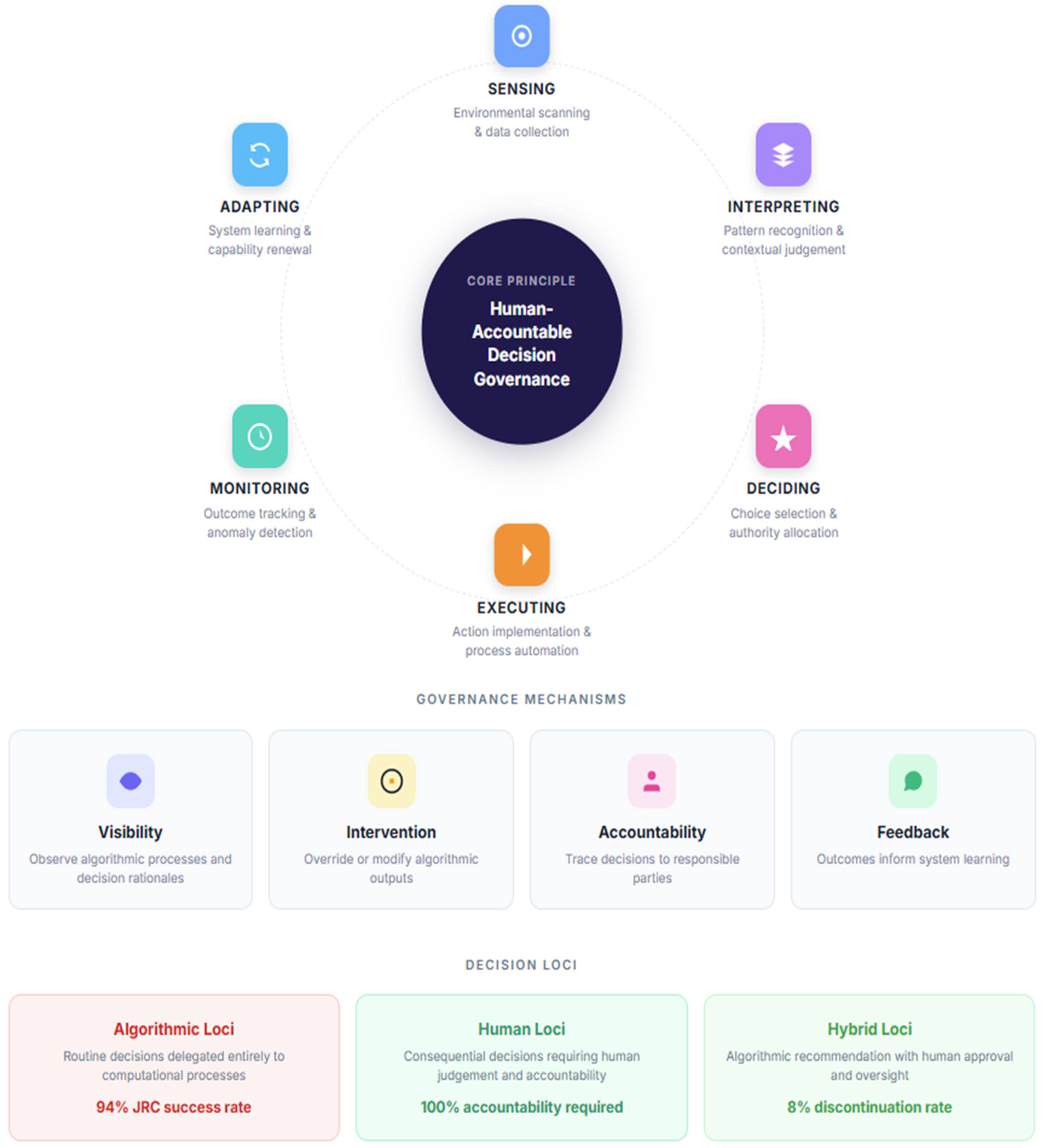 | Decision drift | Gradual expansion of algorithmic decision scope beyond original design parameters without governance review | Deciding | 31 mentions (62%) | Res27: automation enabling focus on “other things” may lead to unchecked scope expansion; Res39: “final say of senior management” must be preserved | 9 cases (24%) | HIGH | Scope creep without authorisation; decisions originally flagged for human review now automated; no periodic scope audits |