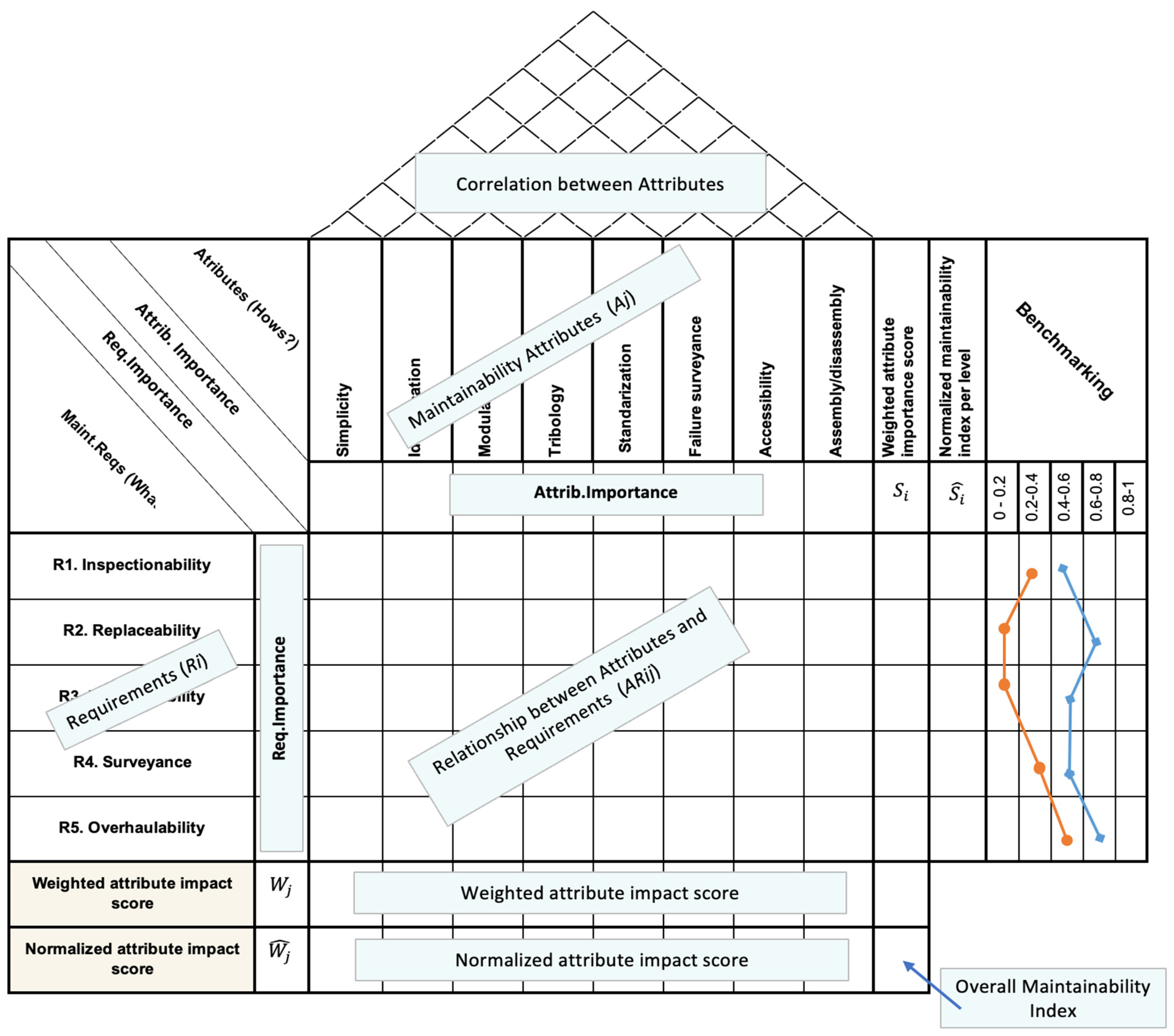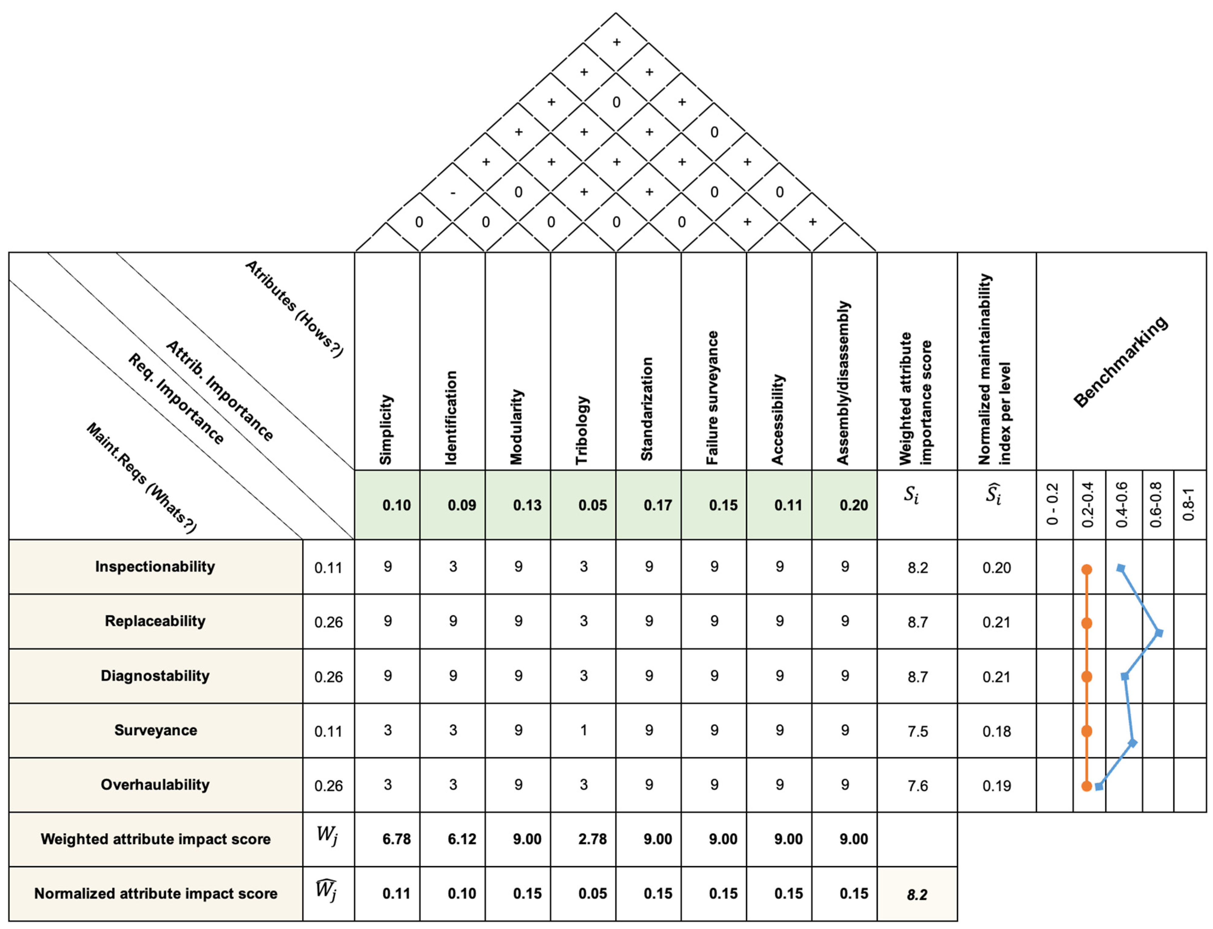 Step 8. Normalizing of Weighted Maintainability Attributes (APj): The relative importance of each maintainability attribute is calculated by using the AHP technique (in a similar manner as shown in Step 4). Therefore, APj values prioritizes which attributes have the greatest leverage for impacting maintainability level and facilitates informed decision-making aimed at improving the asset’s maintainability of new equipment or existing ones. Such relative and normalized weights of the maintainability attribute are located at the “Basement” of the HofM to provide a final priority level for design actions. Such weights (ranging from 0 to 1) indicate, from highest to lowest, the relative contribution of each attribute to meeting all maintainability requirements.