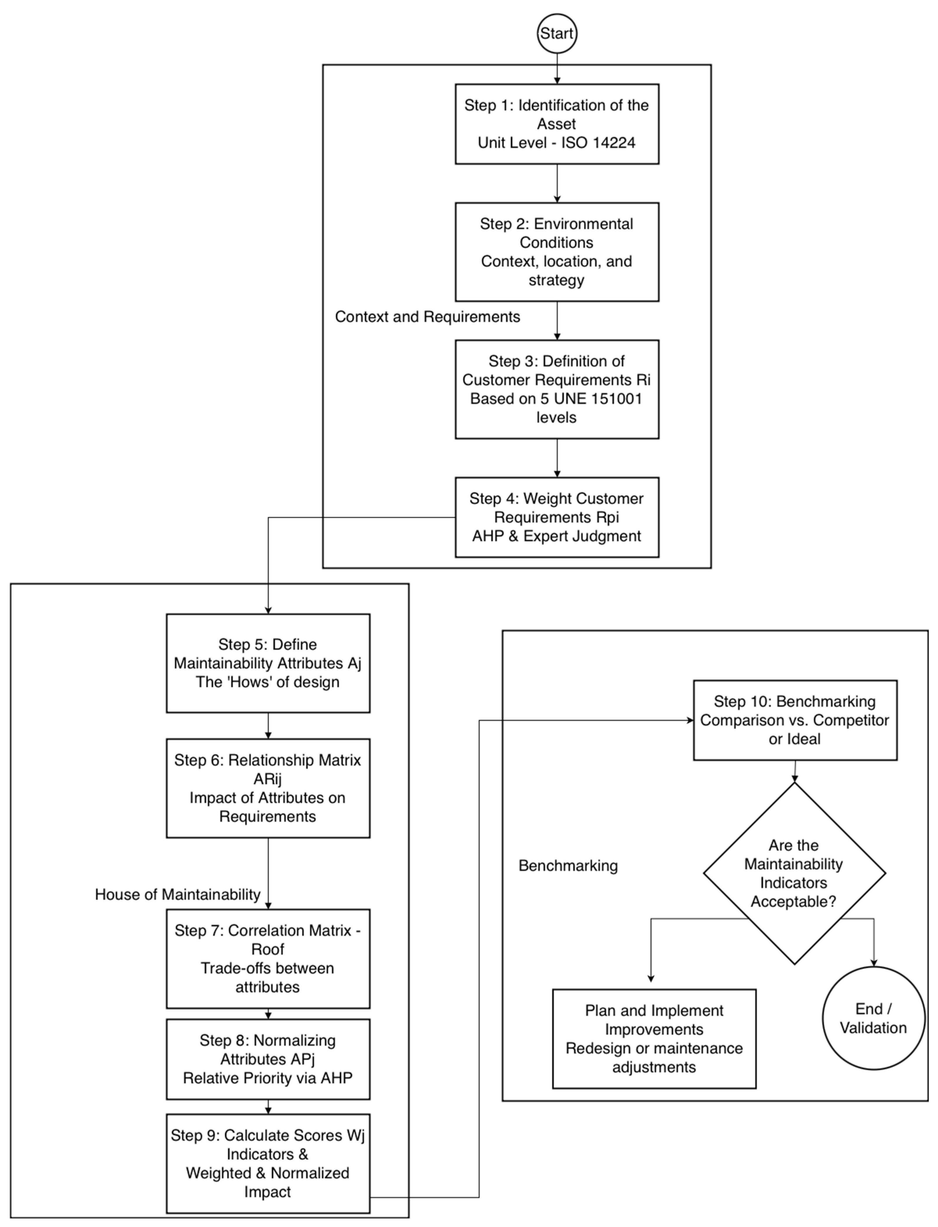 Figure 2, is substantially built upon the procedure defined in the UNE 151001 standard, facilitating the systematic evaluation of physical asset maintainability within the framework of Design for Maintainability (DfM). The HofM integrates the maintenance levels with specific design attributes that influence maintainability. This systematic integration ensures that maintenance requirements are inherently addressed during the design phase, thereby optimizing the efficiency and cost-effectiveness of maintenance activities throughout the asset’s lifecycle. It follows a ten-step procedure, designed to be executed by a cross-functional expert team.