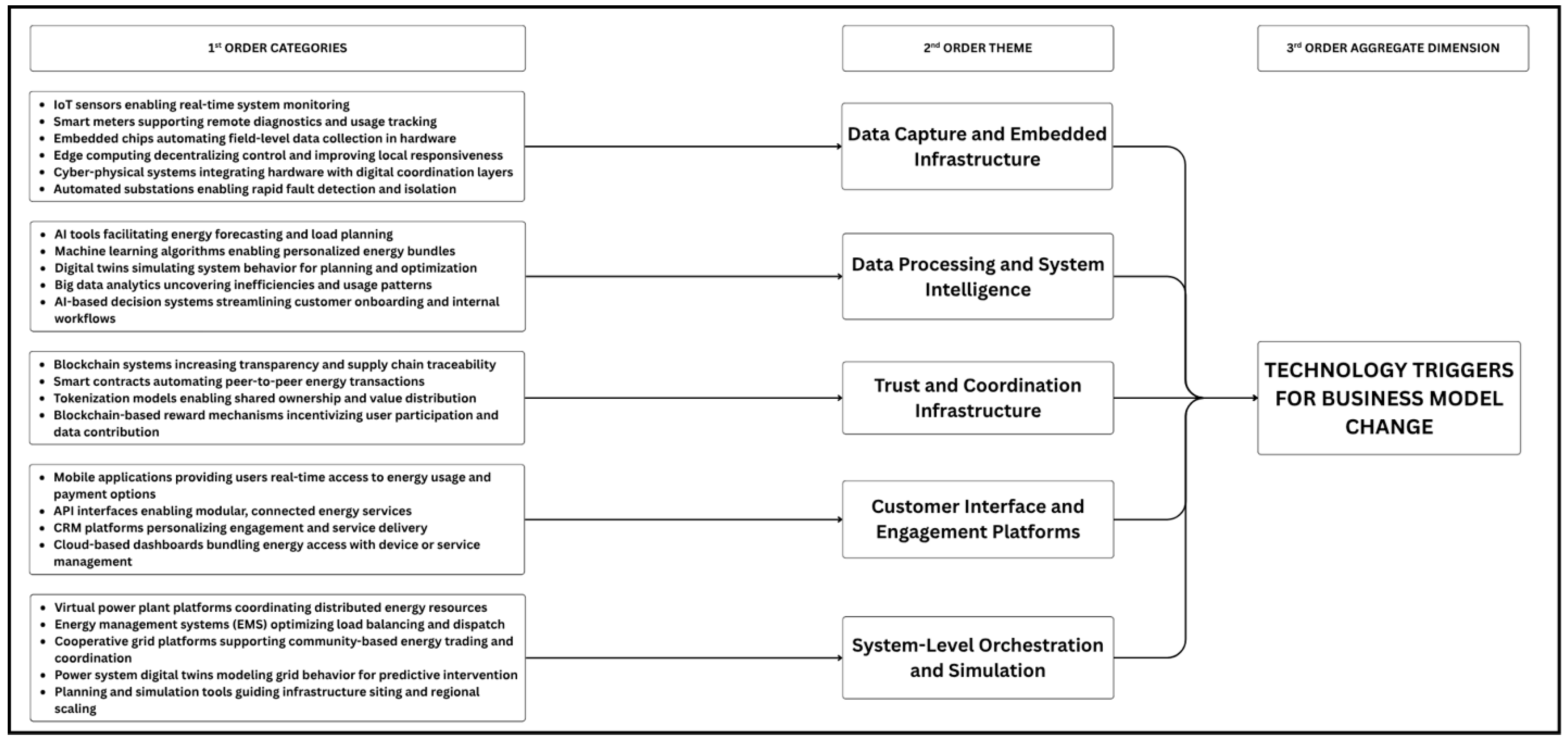 Propagation across components is not automatic and remains context-dependent. A blockchain deployment limited to provenance can strengthen delivery assurance without shifting monetization, an operational upgrade rather than a new revenue logic. Pay-as-you-go models may be innovative in underserved markets yet merely evolutionary in tightly regulated retail regimes. Digital twins often begin as design-stage tools (creation) and, when linked to live telemetry and user interfaces, evolve into operational decision engines that shape scheduling and pricing (delivery and capture). These cases underscore that a technology’s role is application-specific and can sit in different parts of the architecture.