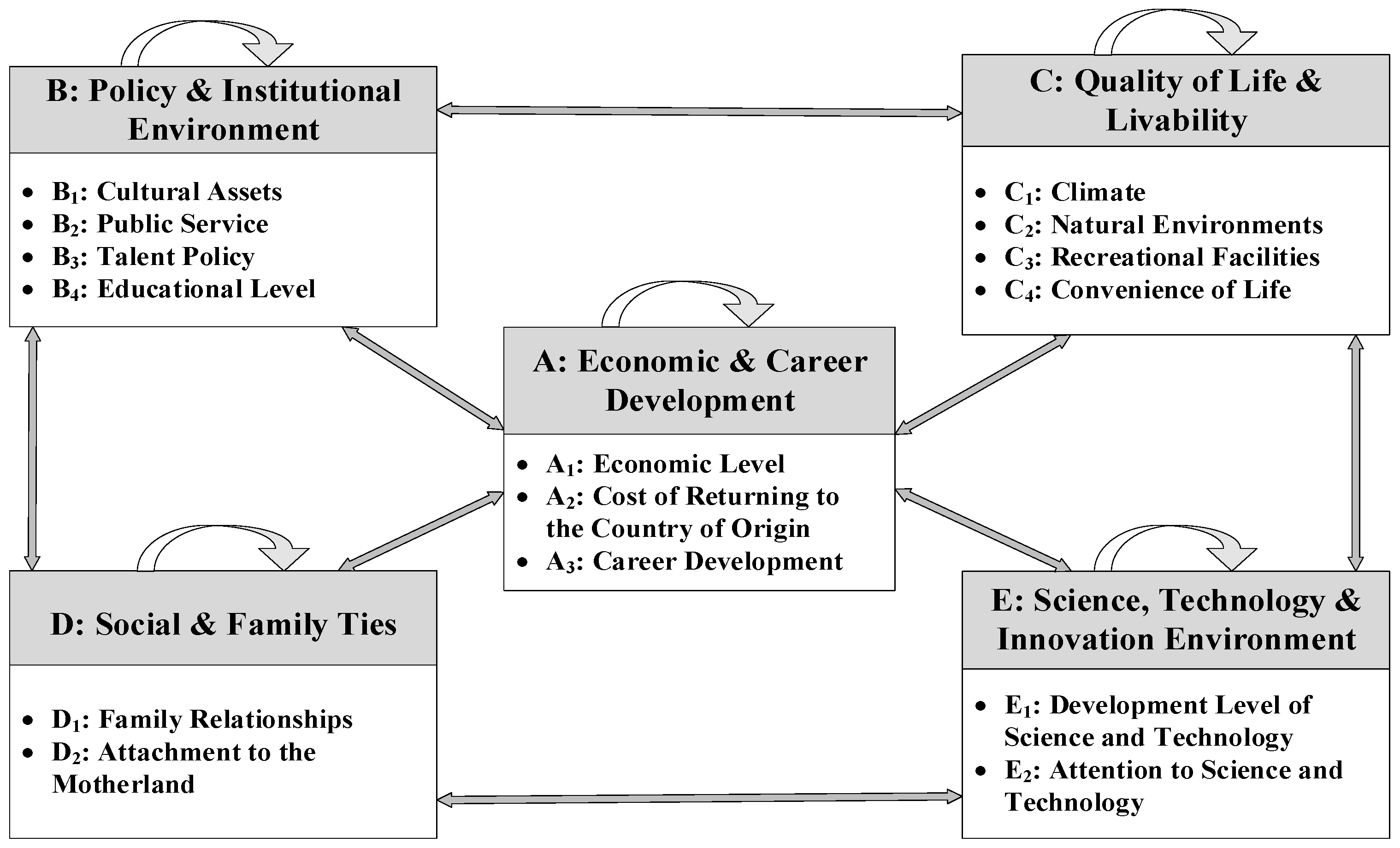 - Cause group (d − r > 0): Economic level (A1), public service (B2), talent policy (B3), educational level (B4), climate (C1), natural environments (C2), attachment to the motherland (D2), development level of science and technology (E1), and attention to science and technology (E2). These factors exert an active influence on other criteria.