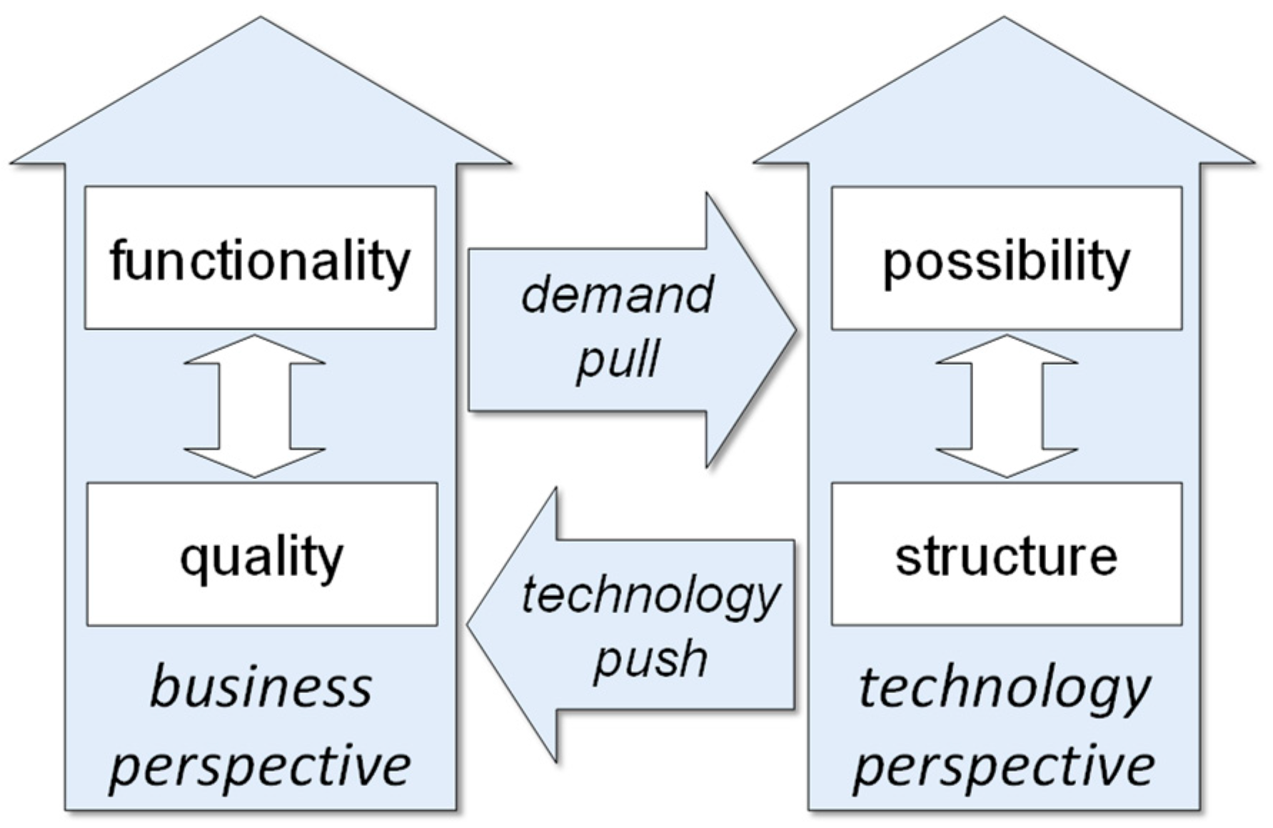 On the left-hand side of the figure, we see the business perspective. The growing business demands for the functionality of digital solutions create a demand-pull force on the technology perspective. At the same time, these growing functional demands create a tension field with quality requirements within the business perspective: for example, data has to be consistent and adequately up-to-date, and decisions have to be correct and adequately in time. The more complex functional requirements get, the harder it is to have a full specification of non-functional requirements that adequately describe all quality constraints.
