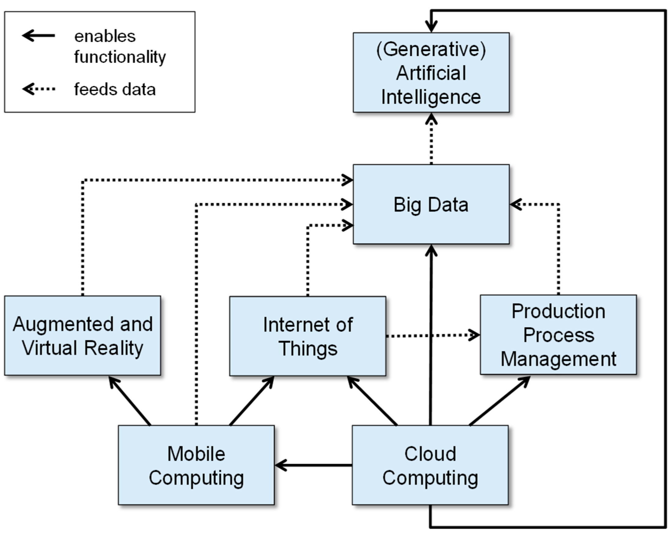 The reality in general, however, is that digital technologies applied in isolation typically do not constitute complete solutions and hence do not produce business results by themselves—the production domain is no exception here. Technologies need to be embedded in a technological context to come to full fruition. This is illustrated for a set of technology classes in