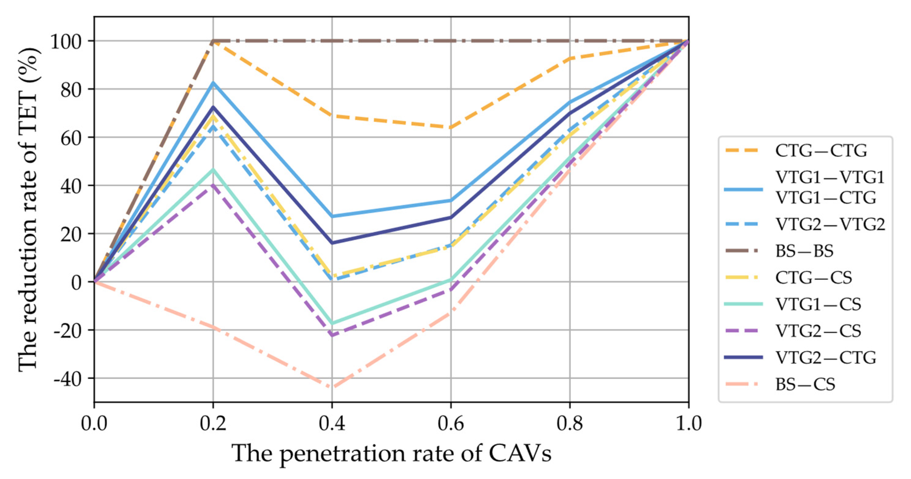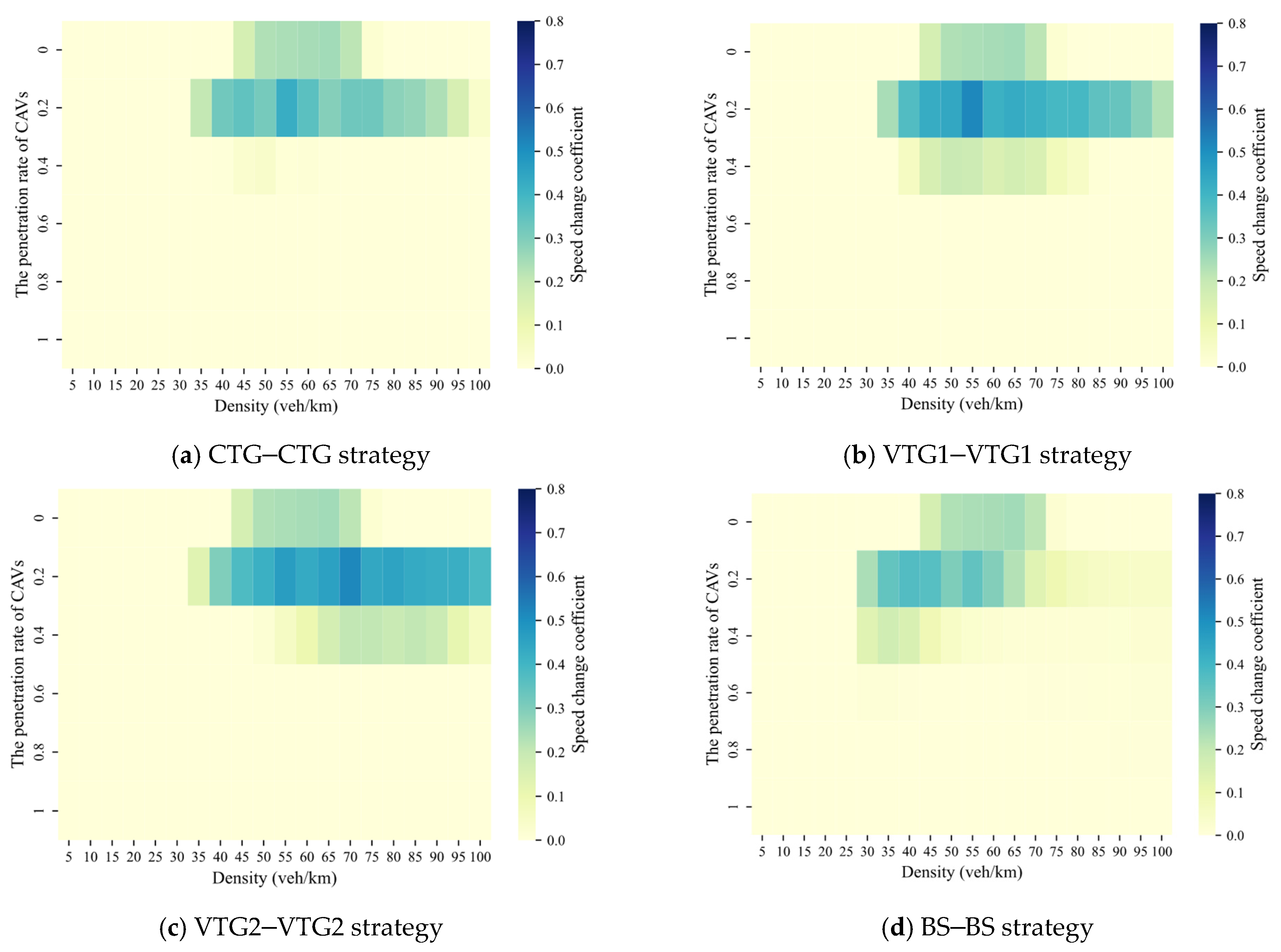- High-performing strategies—including CTG–CTG, VTG1–VTG1, VTG2–VTG2, BS–BS, VTG1–CTG, and VTG2–CTG—effectively stabilize mixed traffic;