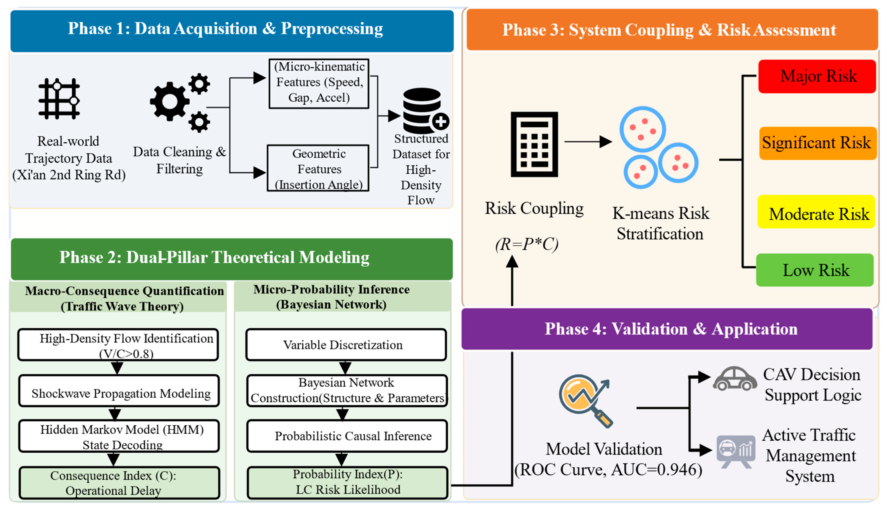 - Dynamic Risk Zoning and Validation: Based on the coupled risk values, we establish a dynamic clustering model to categorize risk into four distinct levels. This provides a quantifiable and actionable standard for real-time traffic monitoring and future Connected and Autonomous Vehicle (CAV) decision logic.