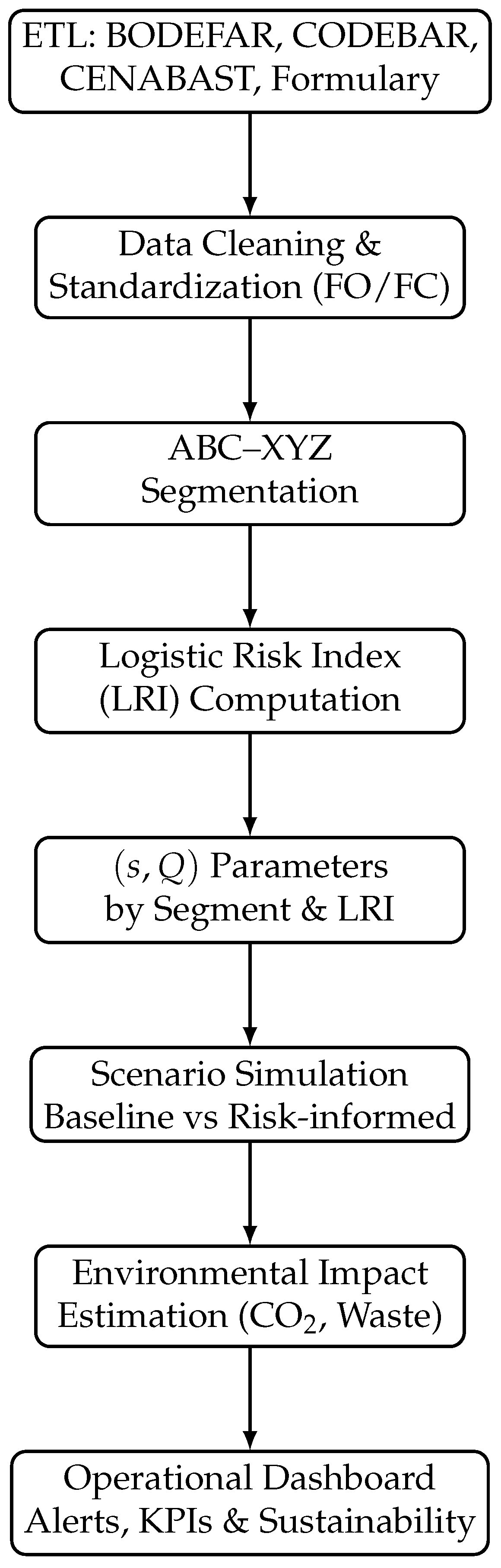 21]. We construct a Logistic Risk Index (LRI) that combines demand variability, supply performance, and clinical criticality proxies, so that inventory parameters adjust to systemic risk for each medicine rather than uniform service levels. Scenario-based analyses compare the baseline configuration versus the risk-informed policy, assessing impacts on stockout exposure, replenishment timeliness, operational efficiency, and estimated environmental benefits [