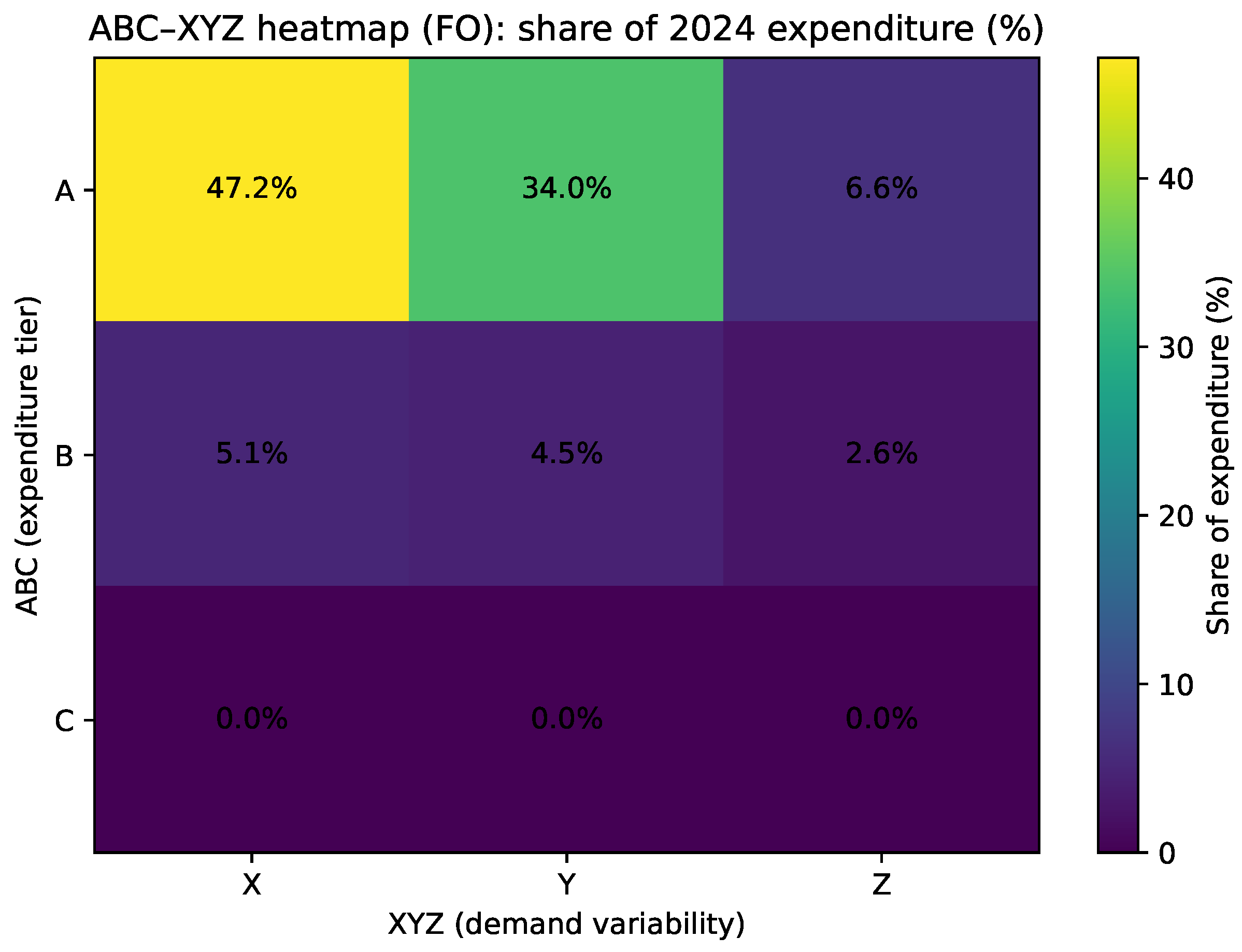 ABC–XYZ Segmentation Results. The ABC–XYZ classification reveals a highly concentrated expenditure structure in the FO subunit. As reported in
