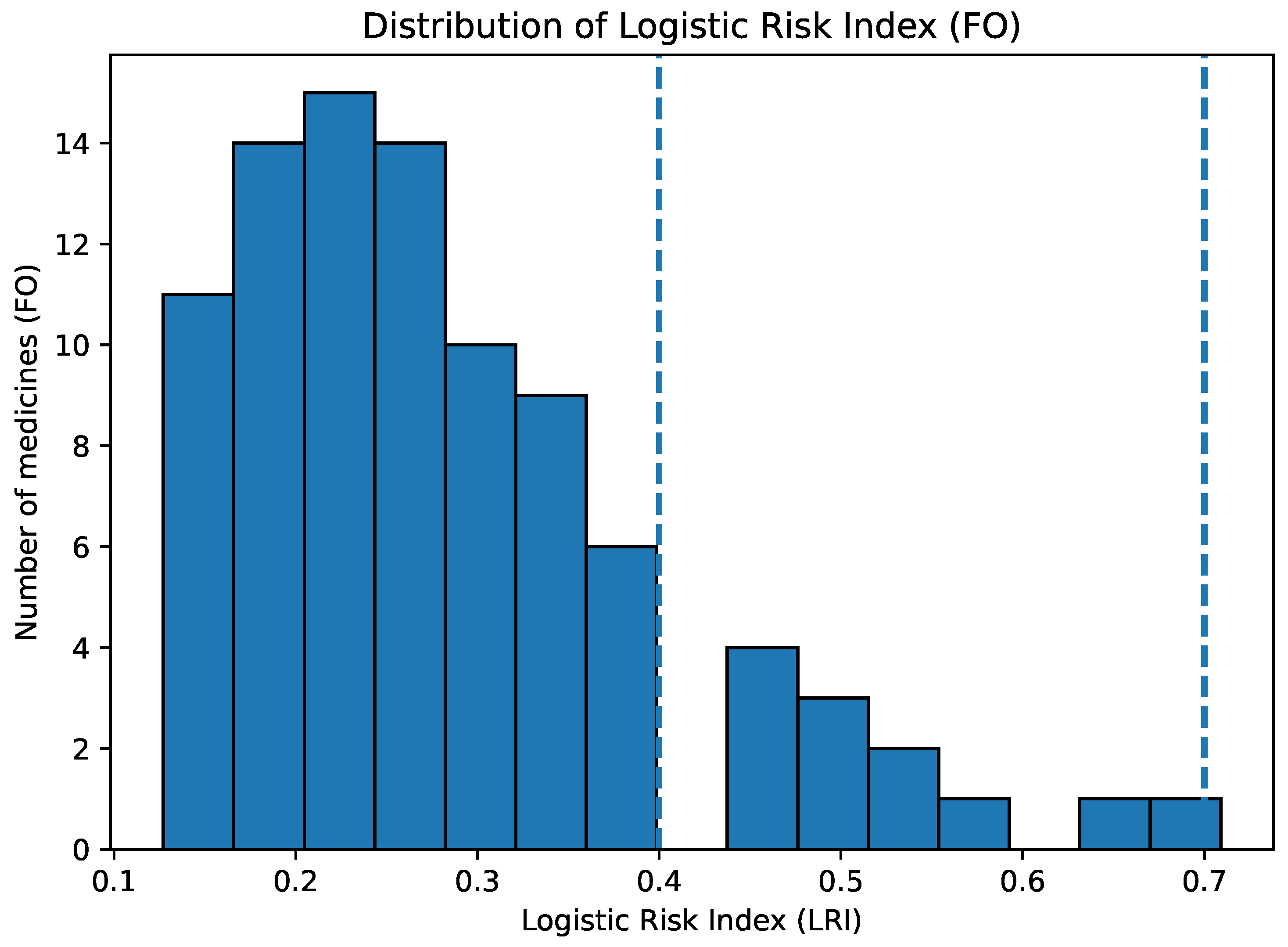 Figure 3 summarises the empirical distribution of the Logistic Risk Index (LRI) for FO medicines. The vertical thresholds at 0.40 and 0.70 correspond to the Low/Medium and Medium/High risk tiers, respectively, and visually support the risk-based screening and selection step described above.