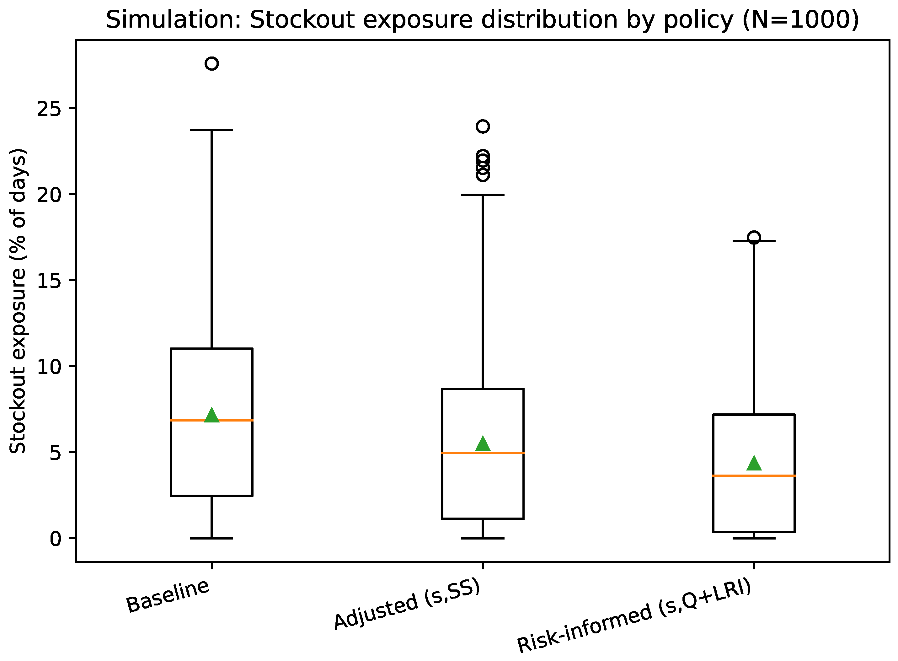 Relative to the baseline configuration, the adjusted policy reduces stockout exposure by approximately 28%, primarily through earlier reorder triggering for high-risk medicines. The fully risk-informed policy achieves a larger reduction of 46%, reflecting the combined effects of differentiated service levels, risk-based safety stock, and staggered replenishment by procurement channel.