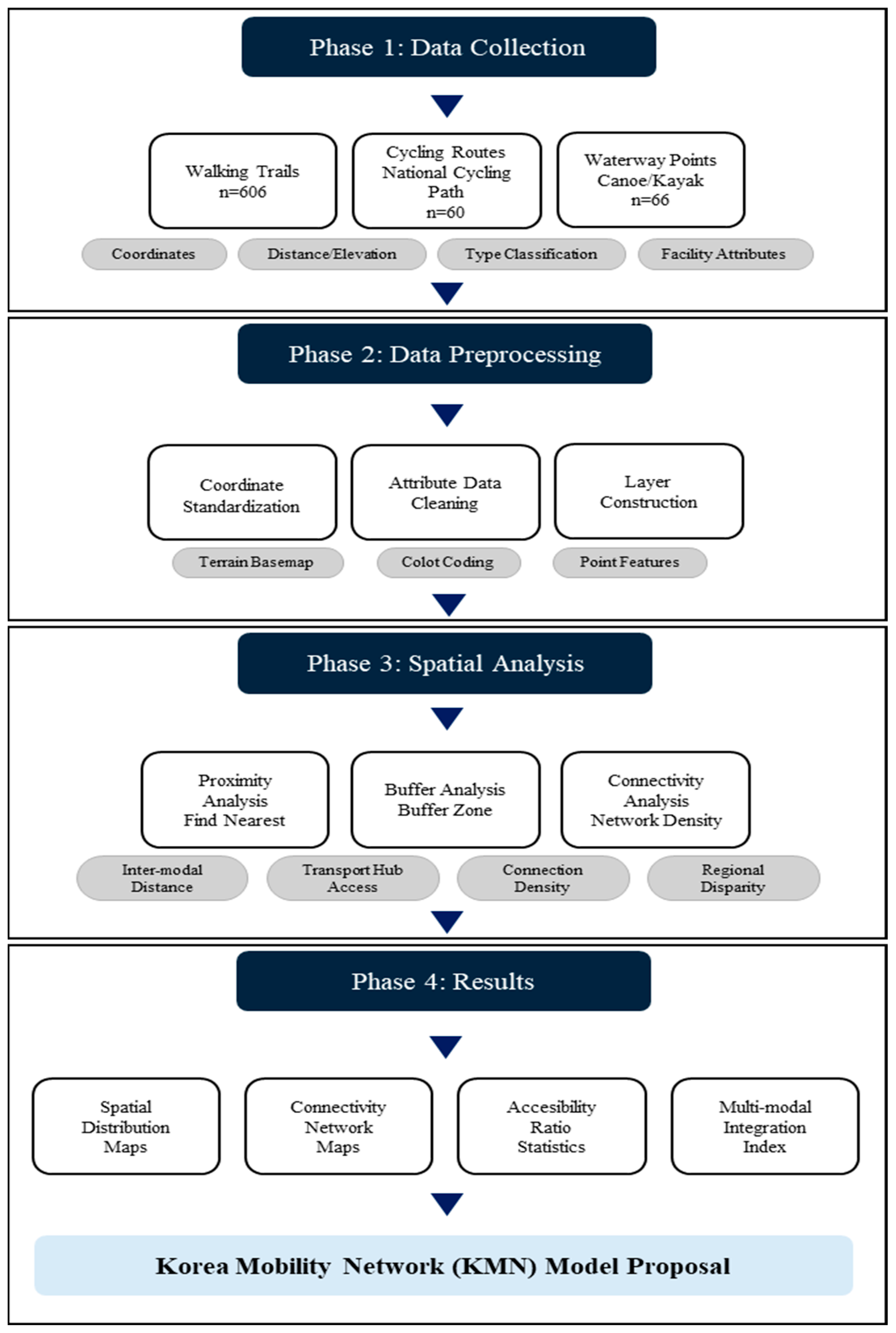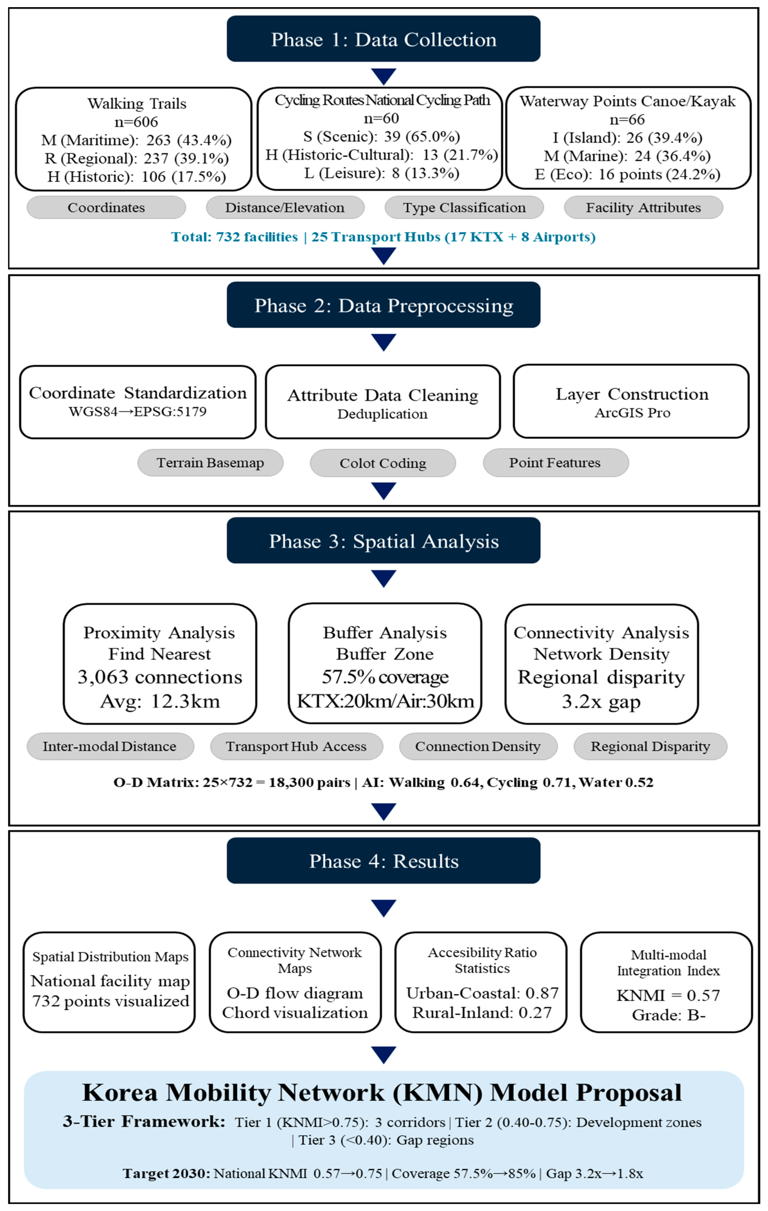 To address this gap, this study investigates the spatial connectivity of Korea’s non-motorized mobility infrastructure by examining how walking, cycling, and water-based resources function collectively as an integrated spatial network. Using GIS-based spatial network analysis, the study evaluates how the structural configuration of this network influences regional accessibility patterns and multimodal mobility integration.