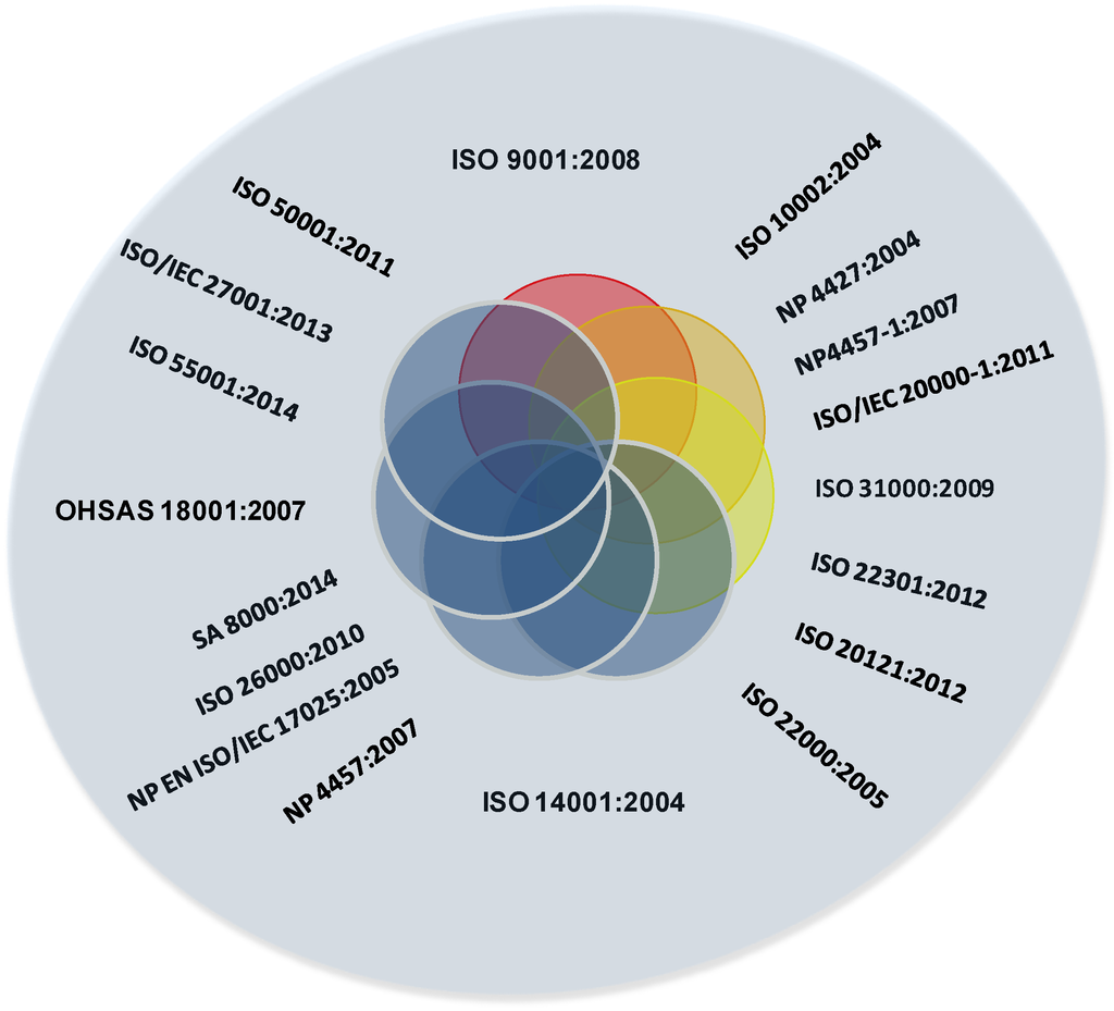 There are examples of MSSs: ISO 9001 for Quality Management Systems []; ISO 14001 for Environmental Management Systems []; OHSAS 18001 for Occupational Health and Safety Management Systems []; ISO 22301 for Business Continuity Management Systems []; ISO 31000 for Risk management []; ISO/IEC 27001 for Information security Management Systems []; NP 4457 for Research, Development and Innovation Management Systems []; ISO 50001 for Energy Management Systems []; and the ISO 55001 for Asset Management Systems [], among several other MSSs, as presented in the Figure 1. This suggests a new framework regarding the implementation of multiple individualized MSs versus an approach to the integrated implementation of these same systems.