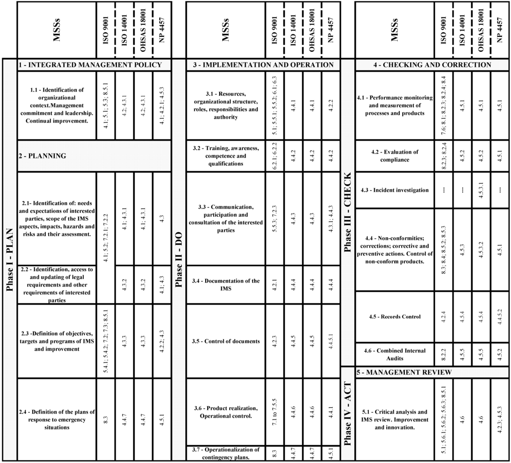 The principles of Quality Management are defined in the ISO 9004 [], annex B: customer focus, leadership, involvement of people, process approach, system approach to management, continual improvement, factual approach to decision making and mutually beneficial supplier relationships. According to the ISO Guide 72 [], anyone drafting these and other MSSs must take into account that the corresponding MSs must consider the phases of the PDCA cycle (Plan, Do, Check, Act): policies and principles, planning, implementation and operation; performance assessment. Within this framework, the structuring of the referred MSSs should be taken into account: management responsibility/planning, resource management, product realization/operational control and measurement and analysis and improvement. On the matrix in Figure 2 the requirements of the ISO 9001 [], ISO 14001 [], OHSAS 18001 [] and NP 4457 [] are incorporated. Further, correspondences have been established, making them compatible with each other as well as with the phases of the PDCAI cycle—(Plan-Do-Check-Act-Improve). The purpose of this matrix is to orientate and align the different aspects of the organizational structure in the same direction, while at the same time creating a structured and useful referential methodology to support an effective alignment and correspondence among the several MSSs versus MSs with inherent compatibilities between each other, for consequent implementation of the related IMS. This matrix provides a straightforward correspondence with the PCDAI cycle, in this circumstance for the IMS, as well as a set of stages (1.1; 2.1...2.4; 3.1...3.7; 4.1...4.6 and 5.1) associated with each PDCAI cycle phase. One of the advantages of this matrix is that it can be easily updated to provide correlations between the clauses of MSSs both in accordance with the ISO Guide 72 [] and to Annex SL [].