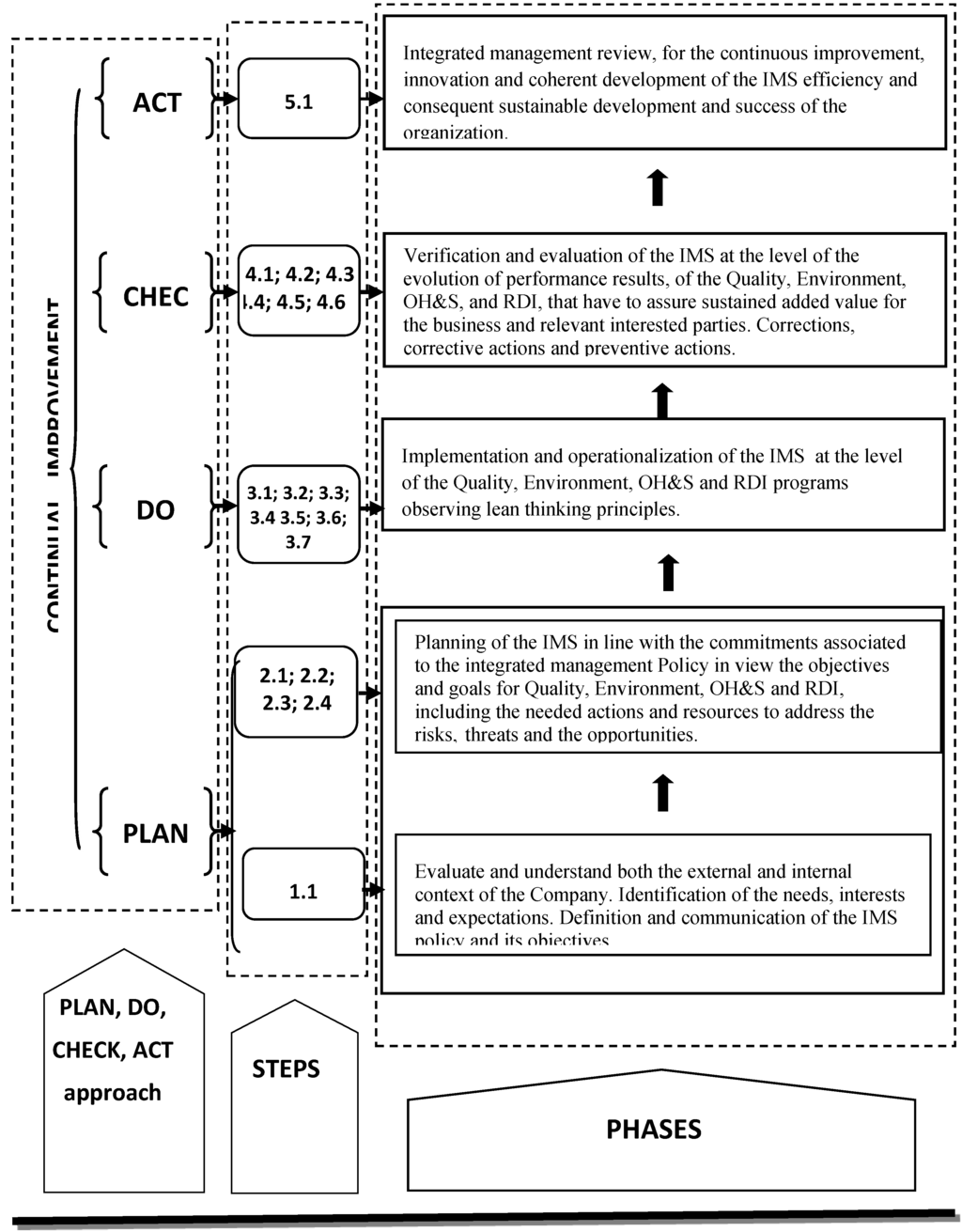 The continuous improvement of company global performance is an objective always present in the development of the IMS [,]. The Company should therefore potentiate for each stage: Plan, Do, Check, Act a careful and methodical analysis of the differences that effectively can be observed in terms of standards requirements under involved equivalent clauses and for each phase and at each stage of development of the SIG-QES, according to the model of Figure 3 [,,], to ensure its compliance and evidence of it, in full conformity.