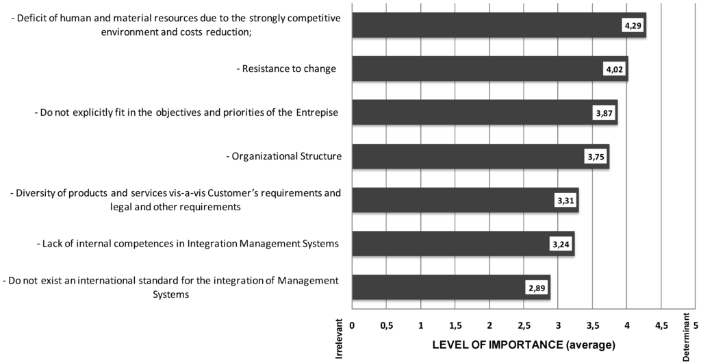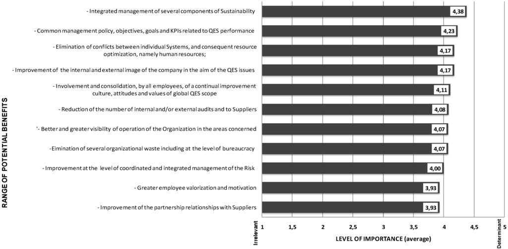 Four main parts were considered on the questionnaire: Part 1—Importance of the twelve factors identified as motivation for the implementation of the IMS for Quality, Environment and Safety (IMS-QES); Part 2—Influence of the nine identified stakeholders on the performance and evolution of the IMS-QES; Part 3—Seven main difficulties in the context of the development and implementation of a model for IMS-QES; and, Part 4—Eleven potential benefits, with the implementation of the IMS. The twelve identified factors on Part 1 of the questionnaire were to: (i) improve the company’s image, near its customers and other stakeholders; (ii) rationalize and optimize management of different resources; (iii) facilitate management of the three sustainable components; (iv) company versus business development; (v) increased requirements of customers and other stakeholders; (vi) competitive advantage; (vii) strategic vision of the business; (viii) natural evolution of the MSs in the company; (ix) continuous improvement of the QMS, EMS, and others MSs through integration; (x) having the MSs implemented separately results in additional costs, creating unnecessary bureaucracy, and an organizational structure less efficient and less lean; (xi) growing appreciation of the IMSs by major customers; and, (xii) as a result from globalization and the growing business requirements. The nine identified stakeholders on Part 2 of the questionnaire were: (i) guidelines, policies, and objectives of the international group in which the company is inserted; (ii) customers; (iii) competitors; (iv) insurers; (v) suppliers; (vi) official entities related to the issues of Quality, Environment, Occupational Health, and Safety; (vii) workers and/or their representatives; (viii) financial institutions; and, (ix) group of directors and managers of the company. The seven identified difficulties on Part 3 of the questionnaire were: (i) deficit of human and material resources due to the strongly competitive environment and costs reduction; (ii) resistance to change; (iii) organizational structure; (iv) diversity of products and services vis-a-vis the customer’s requirements, and legal and other requirements; (v) not explicit, as an objective of the company, the integration of the individual MSs; (vi) lack of internal competences on IMSs; and (vii) lack of an international standard for IMSs. Lastly the eleven identified benefits on Part 4 of the questionnaire were: (i) better and greater visibility of operation of the company concerning MSs; (ii) elimination of conflicts between individual MSs, and consequent resources optimization, namely human resources; (iii) elimination of several organizational and operational waste, resulting from an individual implementation of each MSs; (iv) common management policies, objectives, goals and key process indicators (KPIs) related to the performance of the concerned MSs; (v) improvement of the internal and external image and credibility of the company with focus in the areas of Quality, Environment, Occupational Health and Safety; (vi) involvement and consolidation, by all collaborators, of a culture of continuous improvement, attitudes and values in the scope of the concerned MSs; (vii) reduction of the number of internal and/or external audits; (viii) improvement at the level of the risk management through an integrated and systematized approach; (ix) greater employee valorization and motivation as a result of greater scope of its competencies, tasks and responsibilities with consequent “empowerment”; (x) integrated management of the several components of sustainability; and, (xi) improvement of the partnership relationships with suppliers and of dialogue and compromise with others relevant stakeholders, contributing to the competitiveness of the company. It was considered a Likert scale on the questionnaire: level 1—irrelevant; level 2—not so relevant; level 3—relevant; level 4—very relevant; and level 5—determinant.